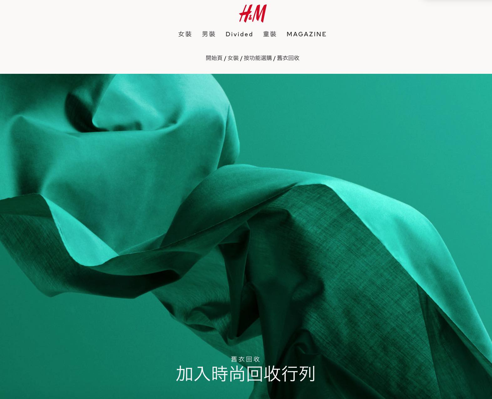 作為快時尚這個製造很多污染的時裝產業的先驅,H&M很快意識到自己對環境的社會責任。自從2013年開始進行布料回收。H&M的回收種類不限衣服品牌,而規定了大家想要回收的衣物必須用袋裝,每袋則至少要有五件衣服。店內回收的話,每次大家都能得到一張優惠卷(Next purchase 15% off)。