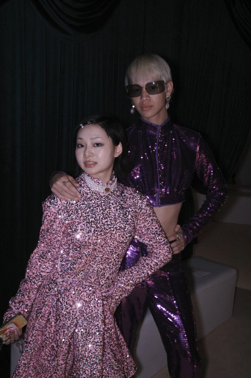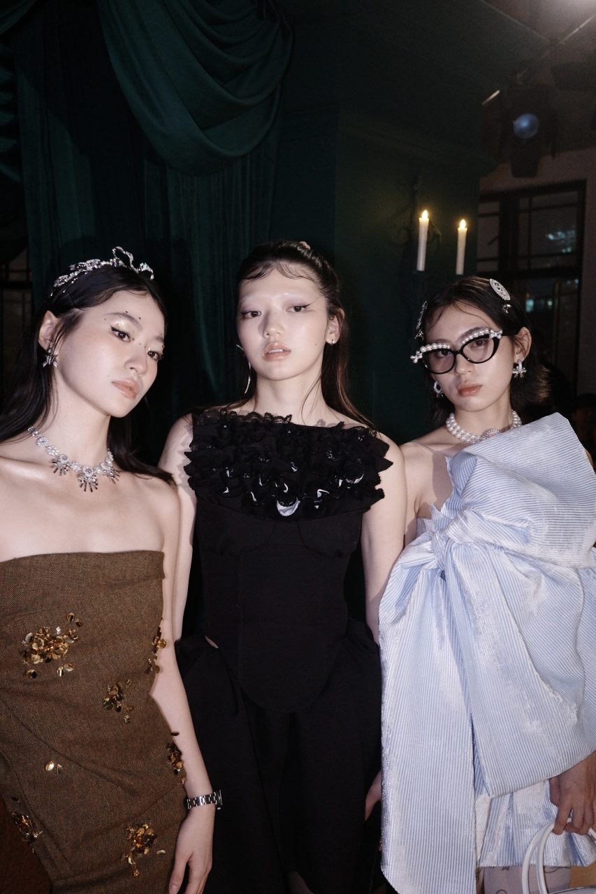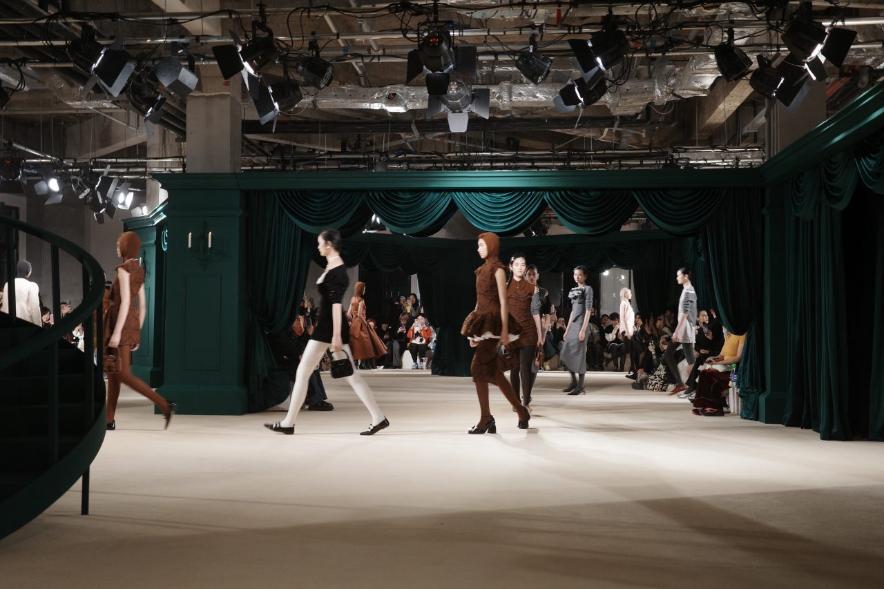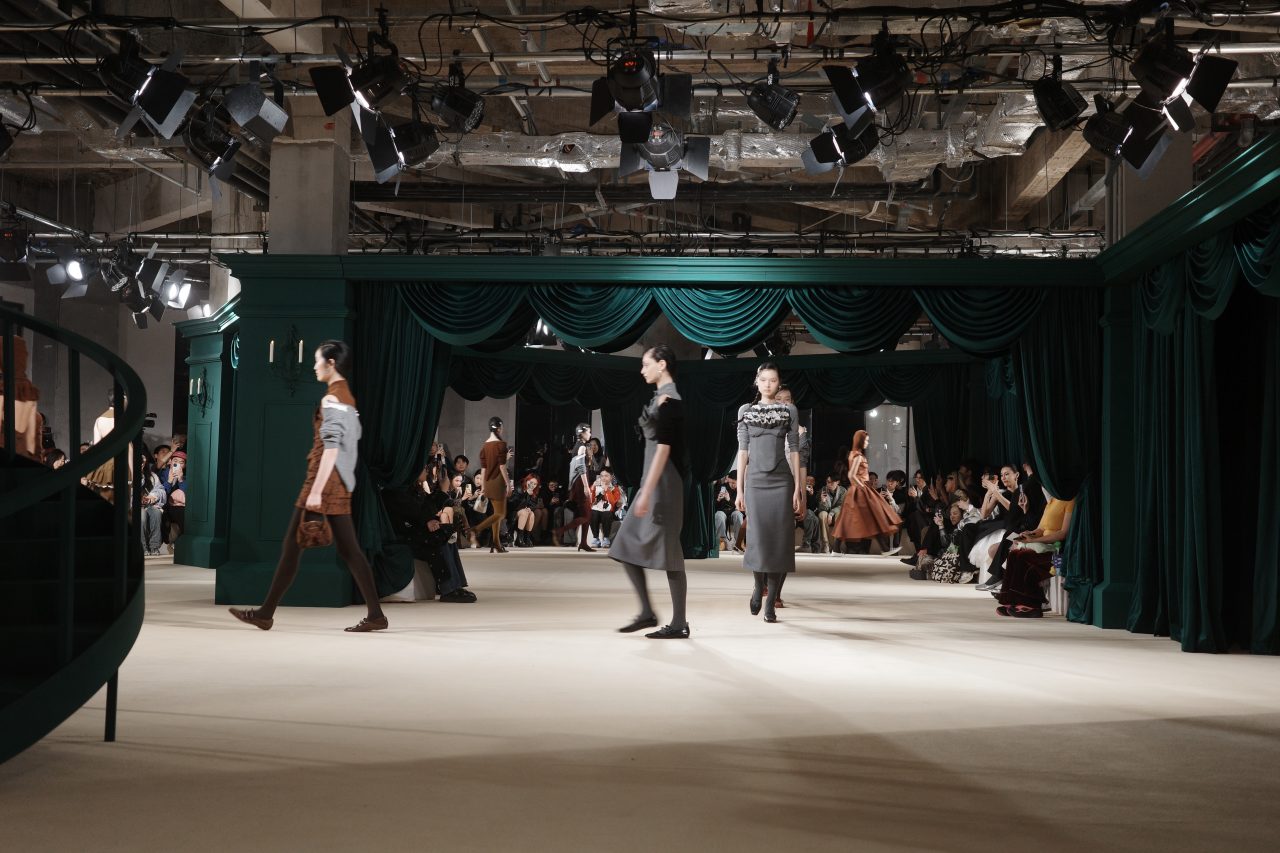 時尚總不是膚淺孵浮華的,在SHUSHU/TONG的異想世界中,服裝成為載體,承載著情緒的表達和對角色的解讀。同樣在中實大樓舉辦,SHUSHU/TONG 2024秋冬系列時裝展為本季時裝週畫上完美的句號。現場由墨綠色幕布分隔開,並放置同色系旋轉樓梯裝置,裝飾上精緻的水晶吊燈,營造復古華麗的氣息。