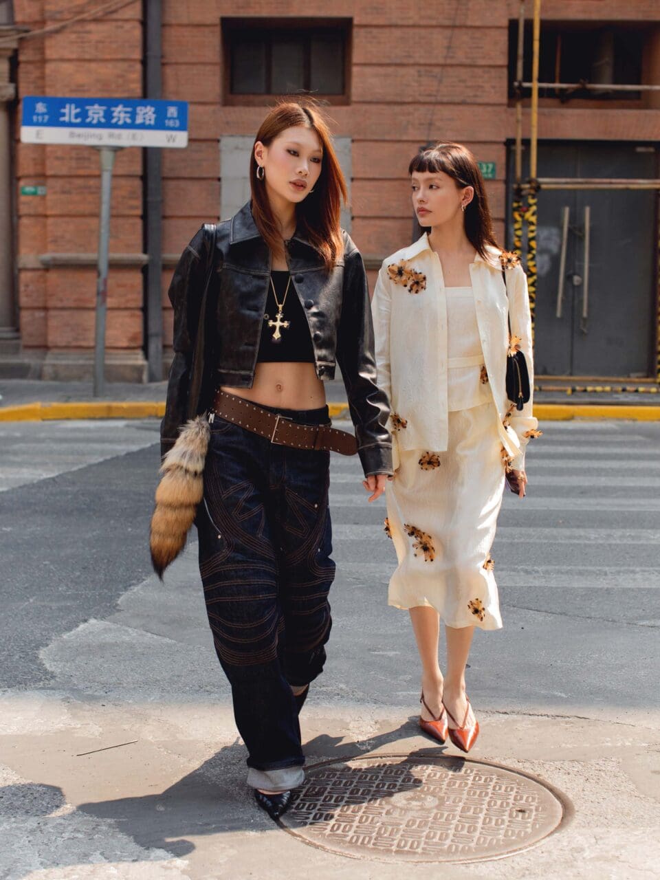 然而,真正體現風格變革的,往往不僅限於天橋,而是來自街頭的即興演繹。今季上海時裝週,隨着新中式風格的崛起,傳統設計語彙在現代剪裁中找到新的平衡點,而長襪、豹紋、皮革與毛毛元素的運用,則進一步豐富了造型的層次,構築出屬於上海的時尚敘事。