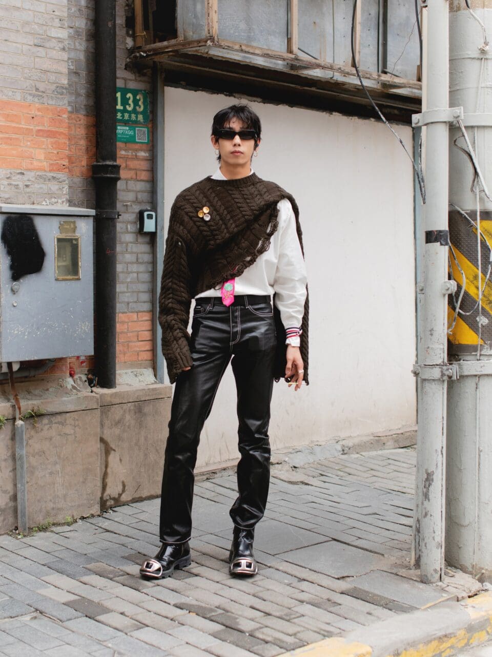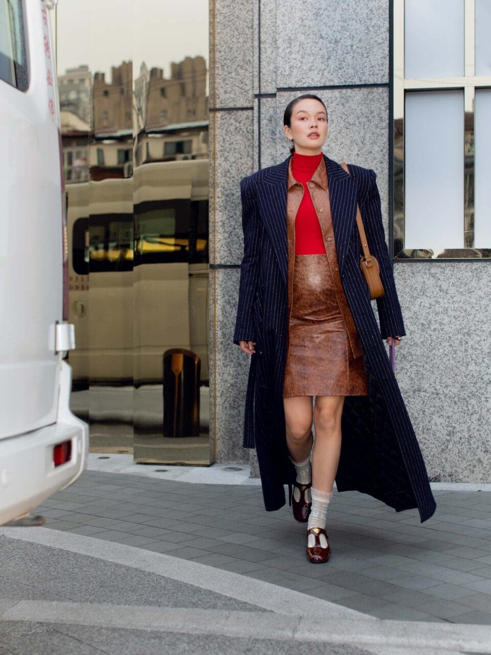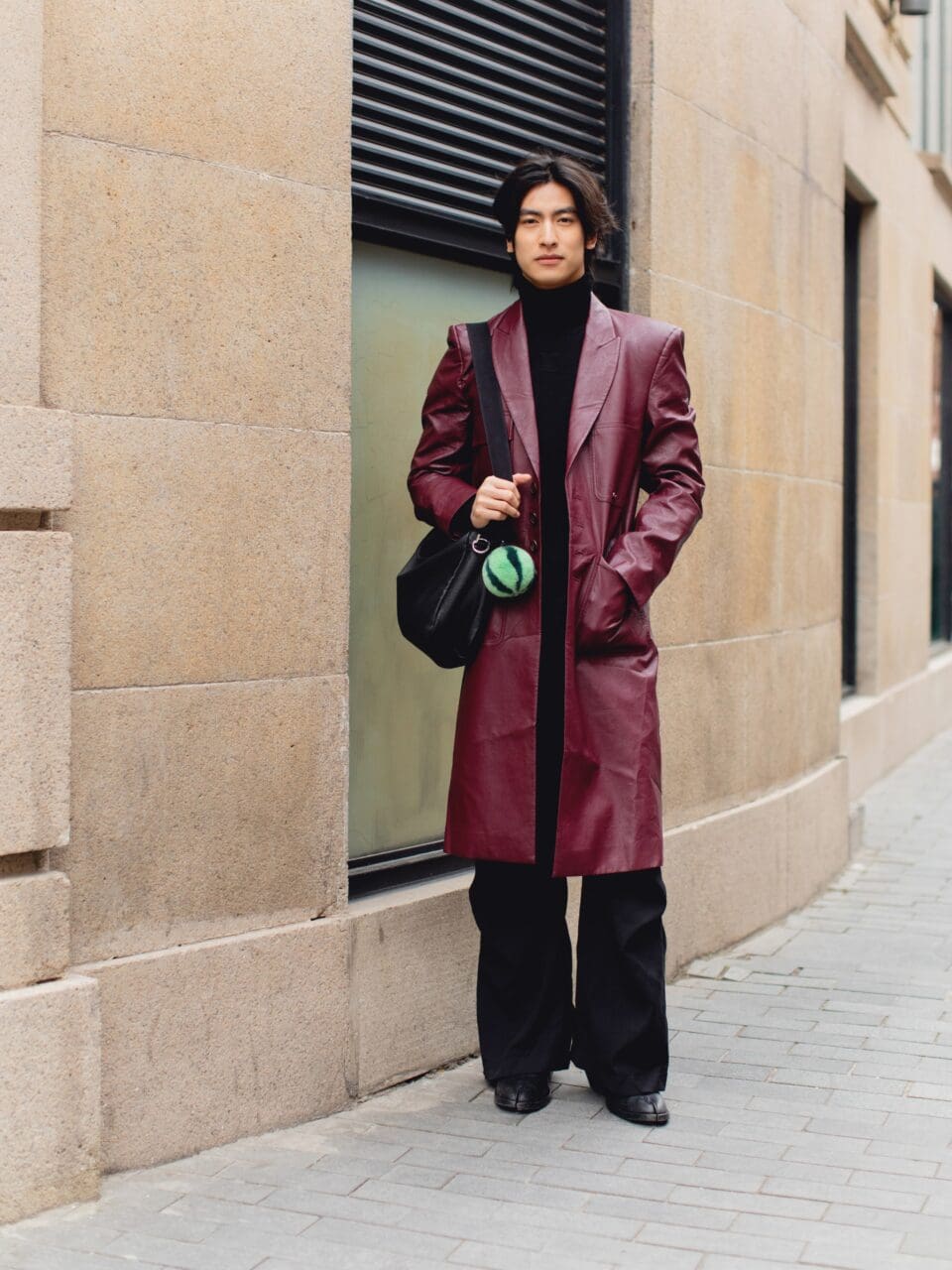 皮革向來是秋冬衣櫥的關鍵元素,而今季上海時裝週的街拍造型則更強調剪裁與結構感。長版皮革大衣營造強烈氣場,搭配寬褲或流線型裙裝,展現俐落輪廓;短版皮革外套則與Crop Top和高腰牛仔褲組合,突顯身形比例。此外,啡色皮革外套與幾何圖案毛衣的搭配,亦讓Preppy Style呈現更高級的視覺效果。本季的皮革趨勢不再只是關於「酷感」,而是藉由不同材質處理與搭配方式,塑造出更具層次的風格變化。