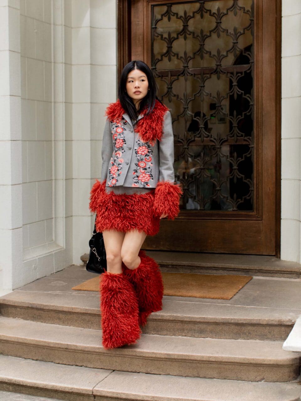 今季上海時裝週,毛毛元素不僅出現在經典的皮草大衣與披肩,亦成為配飾與細節設計的亮點。手袋、鞋履上的絨毛點綴,為極簡風格增添一絲柔和質感;而灰色套裝裙上覆蓋大面積紅色毛毛細節,則營造強烈的視覺對比。在上海時尚達人的演繹下,毛毛元素不再只是奢華的象徵,而是透過顏色與結構的巧妙運用,帶出Gen Z的時尚態度——既大膽,又不失玩味。