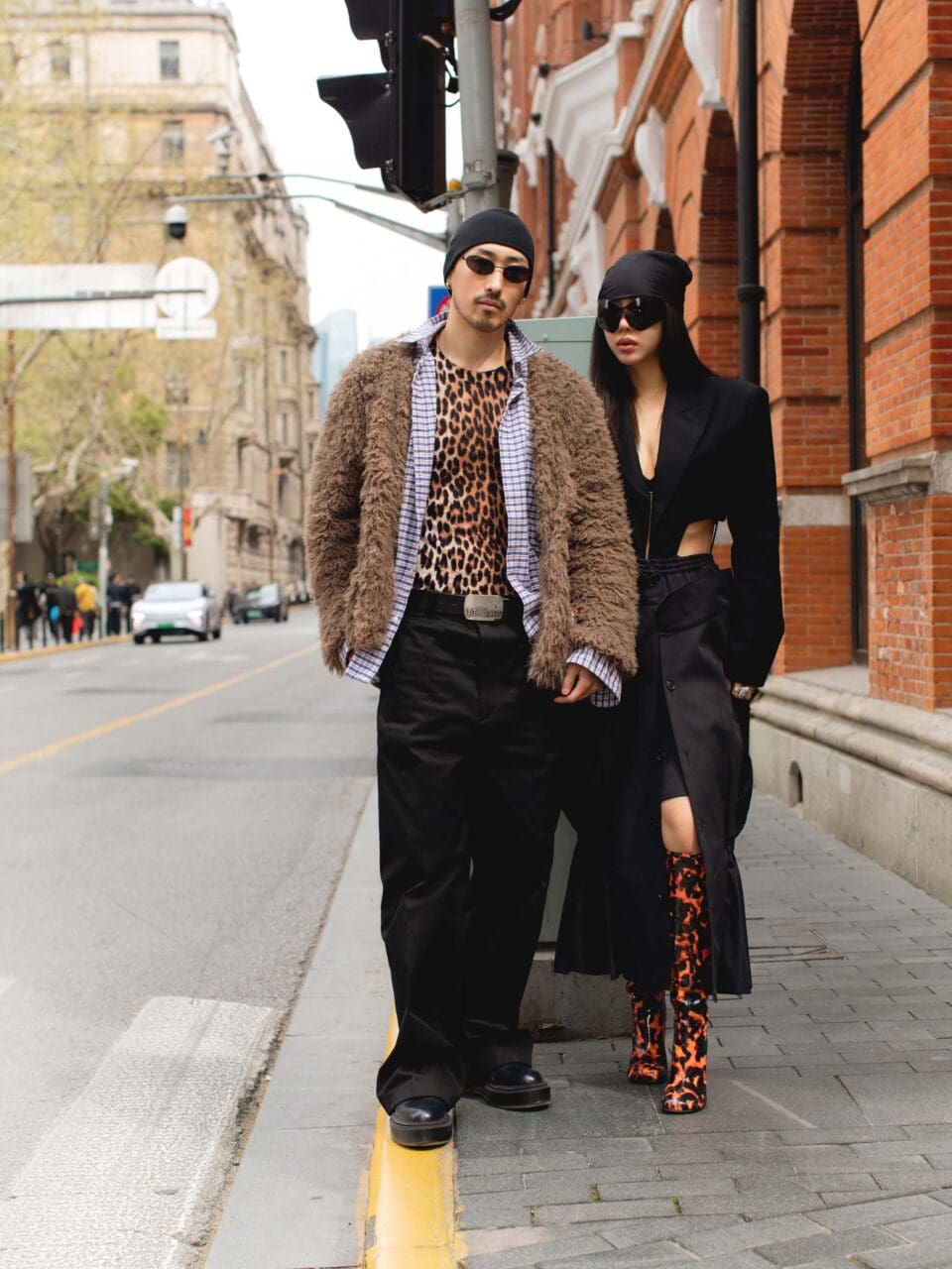 豹紋作為經典圖騰,今季在街頭造型中的運用更顯成熟與內斂;印花襯衫搭配素色風衣,減少視覺上的衝擊感;豹紋皮草外套則以黑色單品平衡,避免過度張揚;紅黑拼色豹紋外套與高跟靴的組合,亦成為值得關注的搭配方式。這股趨勢在上海潮人的精彩搭配下,不再只是關於「叛逆、性感」,而是一種對經典的新詮釋,呈現都市女性的多面特質。