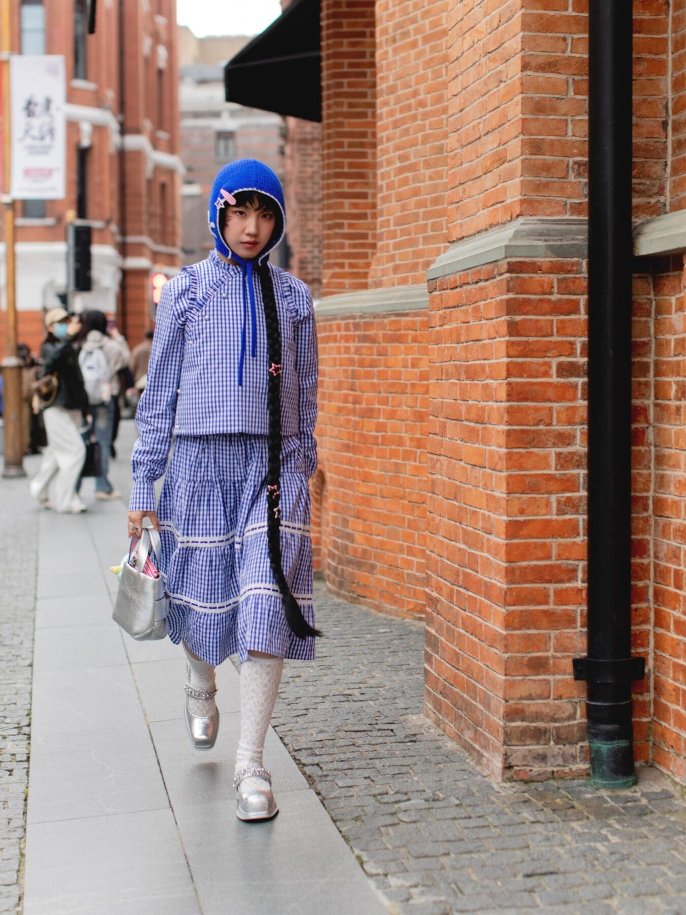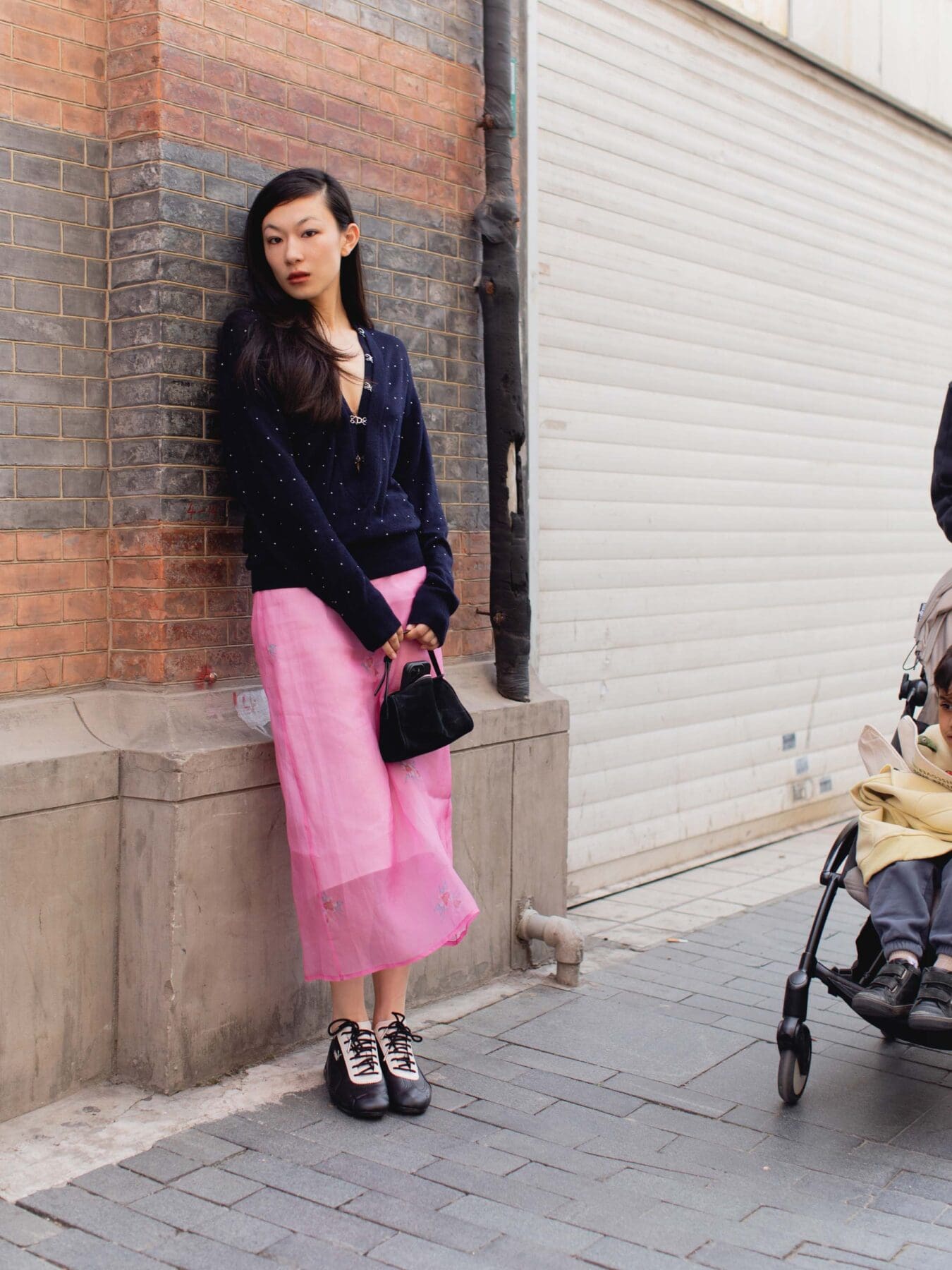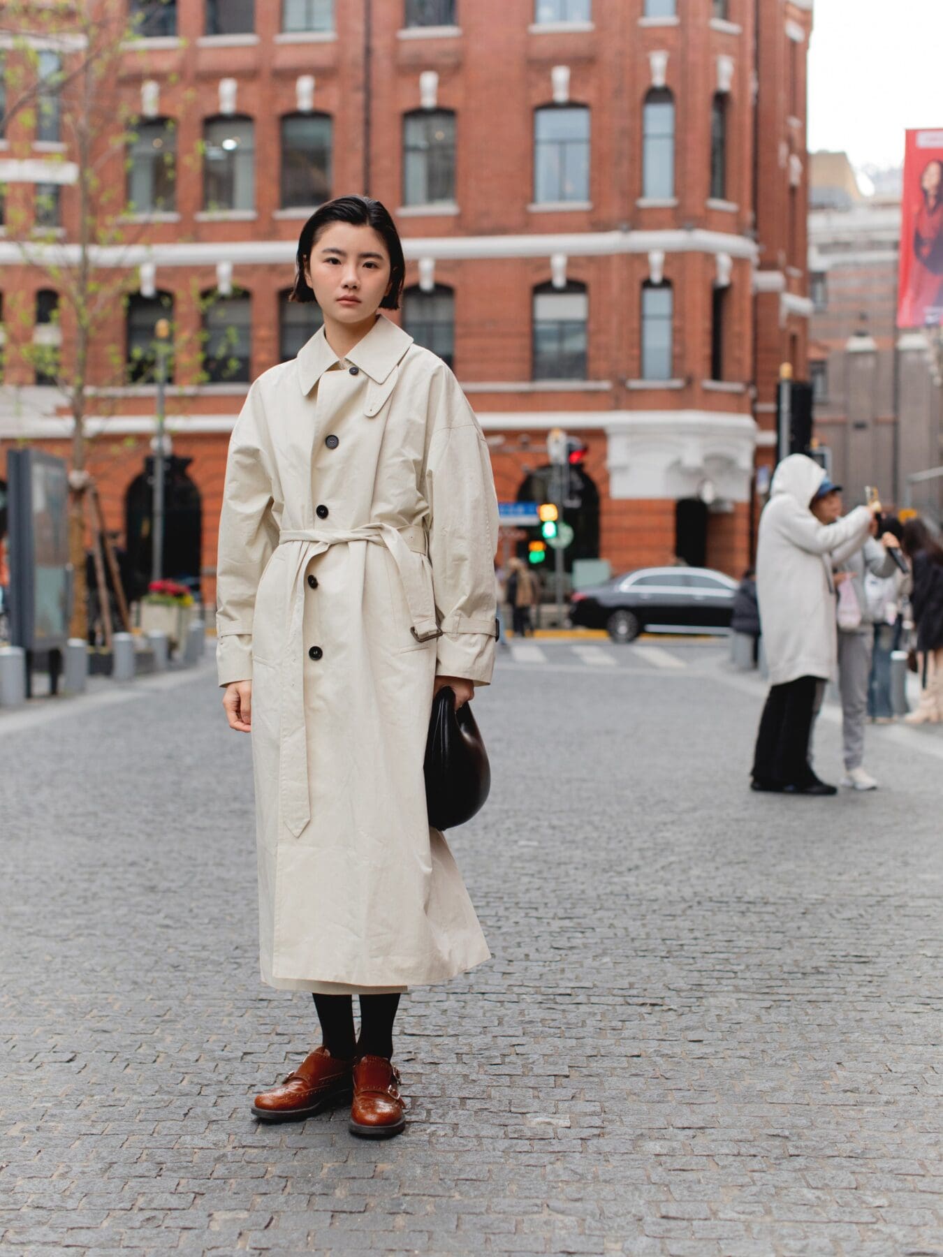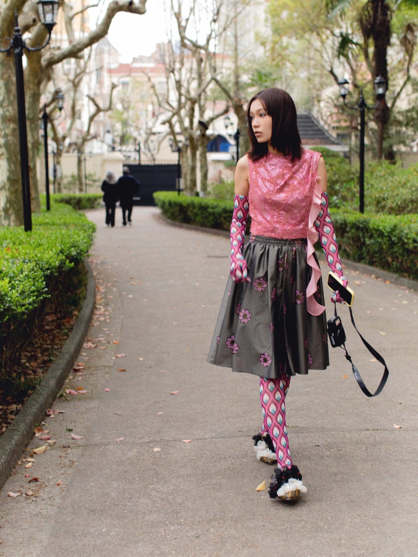 自Miu Miu近季系列帶動長襪熱潮後,這一元素在上海街拍中亦有不同演繹。喱士透視襪子搭配瑪莉珍鞋,呈現復古氣息;酒紅色長襪與啡色高跟鞋的組合,則打破正式與休閒的界限,營造優雅舒適氛圍。值得注意的是,上海街拍中的長襪趨勢不再侷限於學院風,而是透過不同材質、圖案與搭配方式,探索更個性化的穿搭語境。
