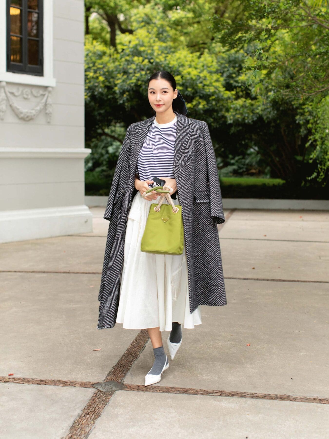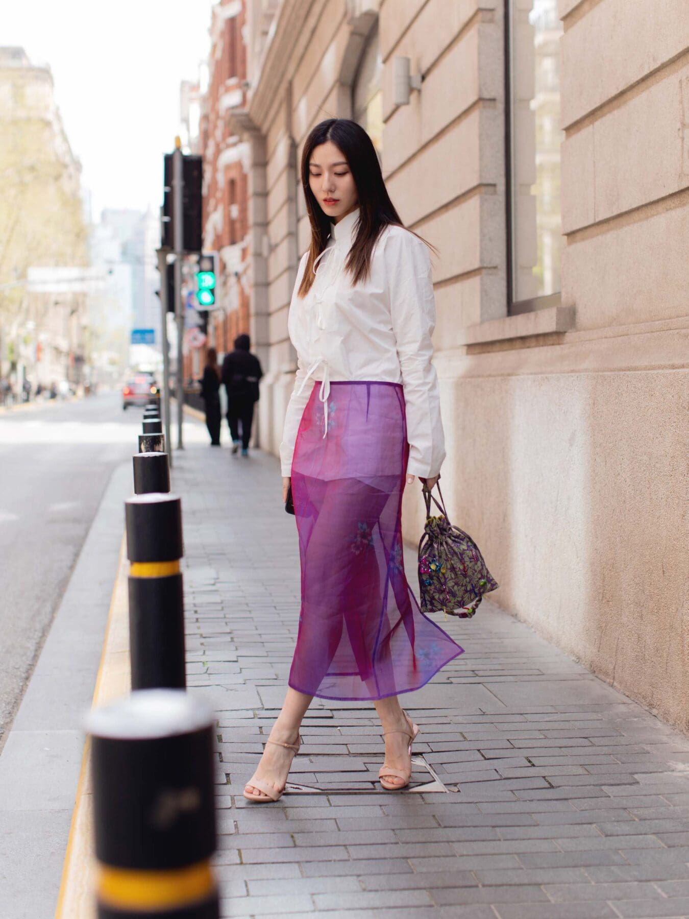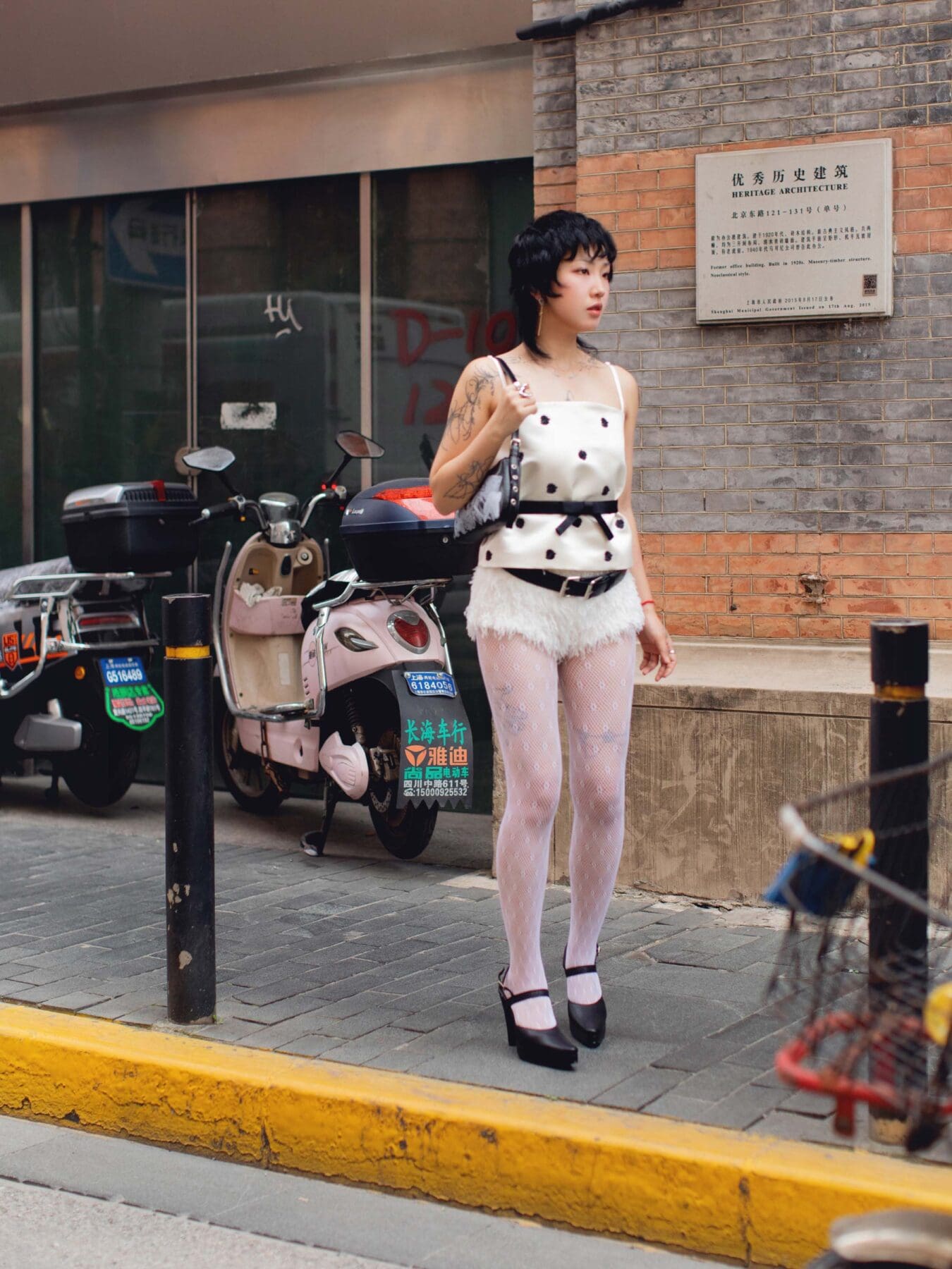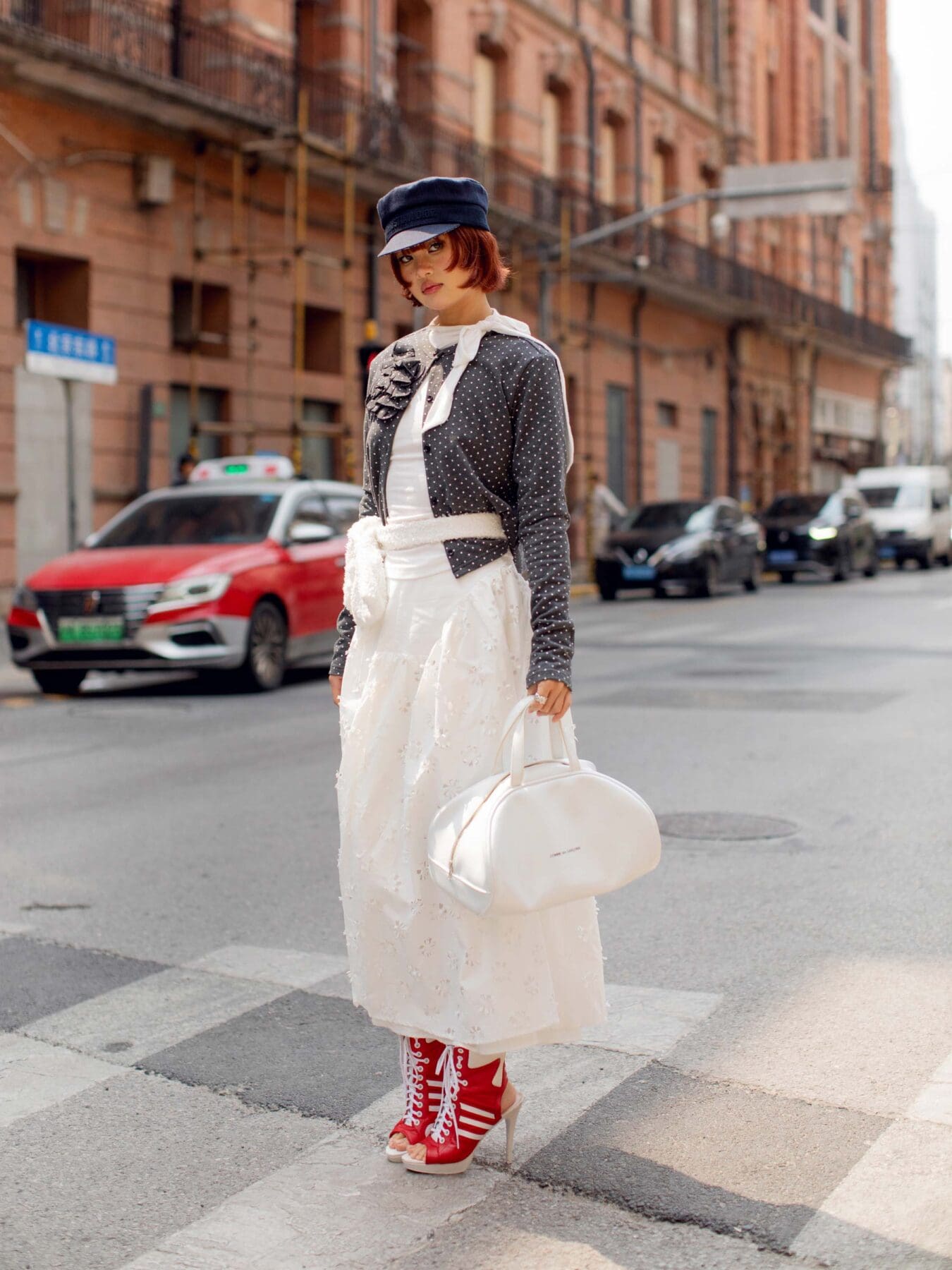 自Miu Miu近季系列帶動長襪熱潮後,這一元素在上海街拍中亦有不同演繹。喱士透視襪子搭配瑪莉珍鞋,呈現復古氣息;酒紅色長襪與啡色高跟鞋的組合,則打破正式與休閒的界限,營造優雅舒適氛圍。值得注意的是,上海街拍中的長襪趨勢不再侷限於學院風,而是透過不同材質、圖案與搭配方式,探索更個性化的穿搭語境。