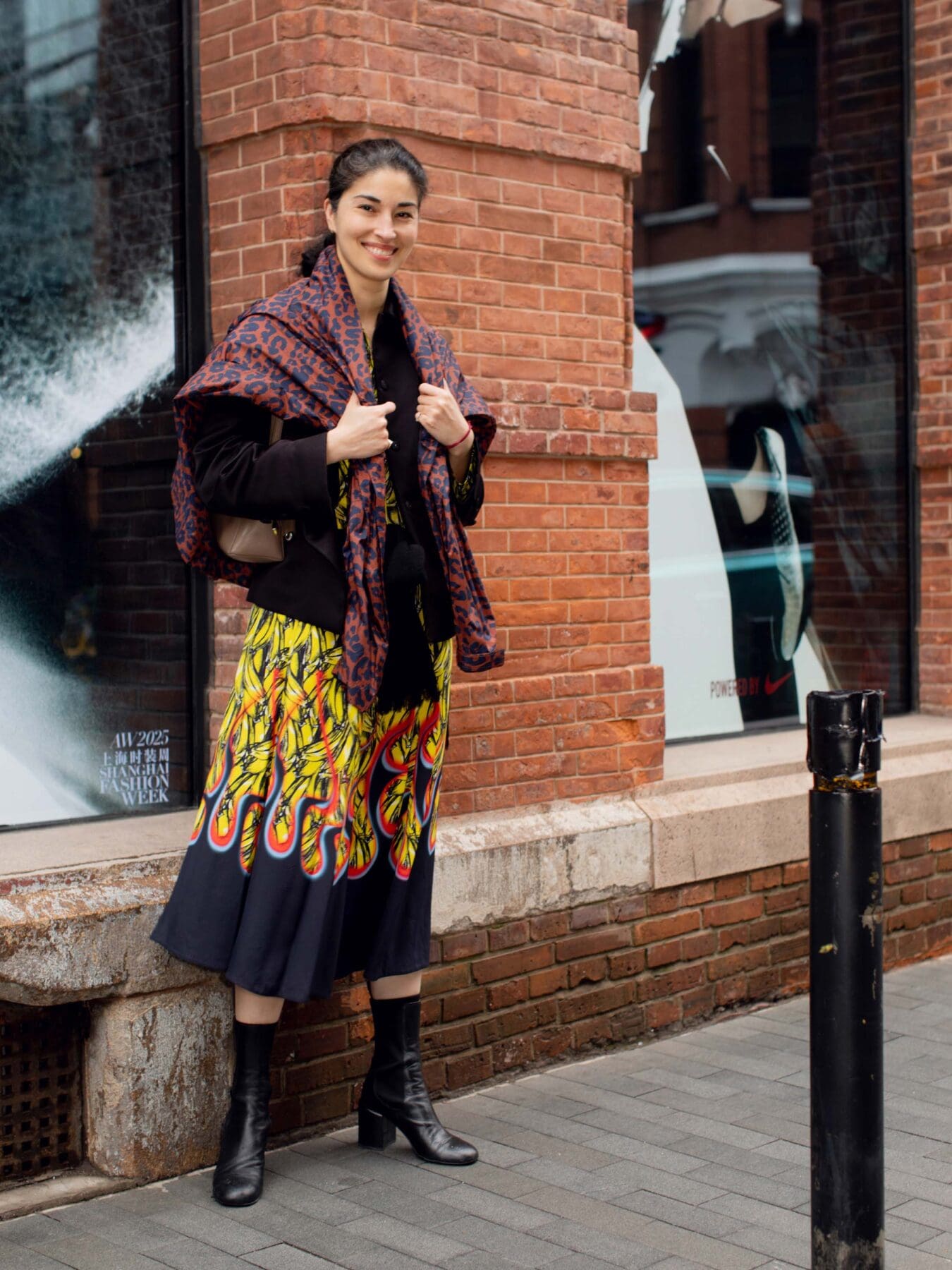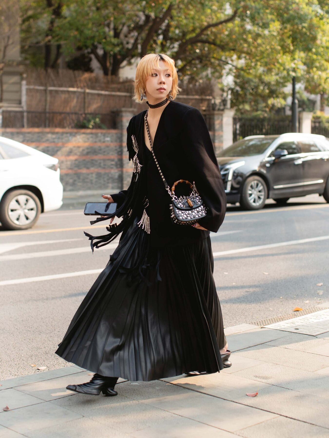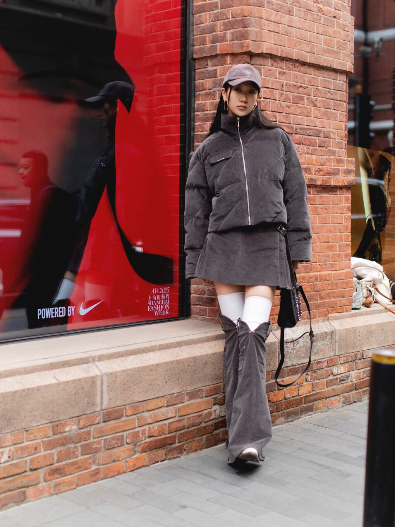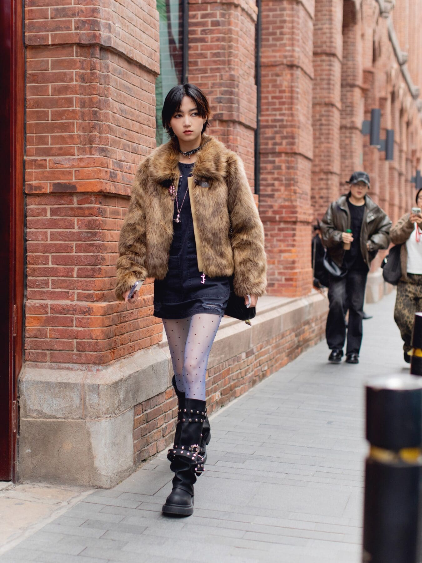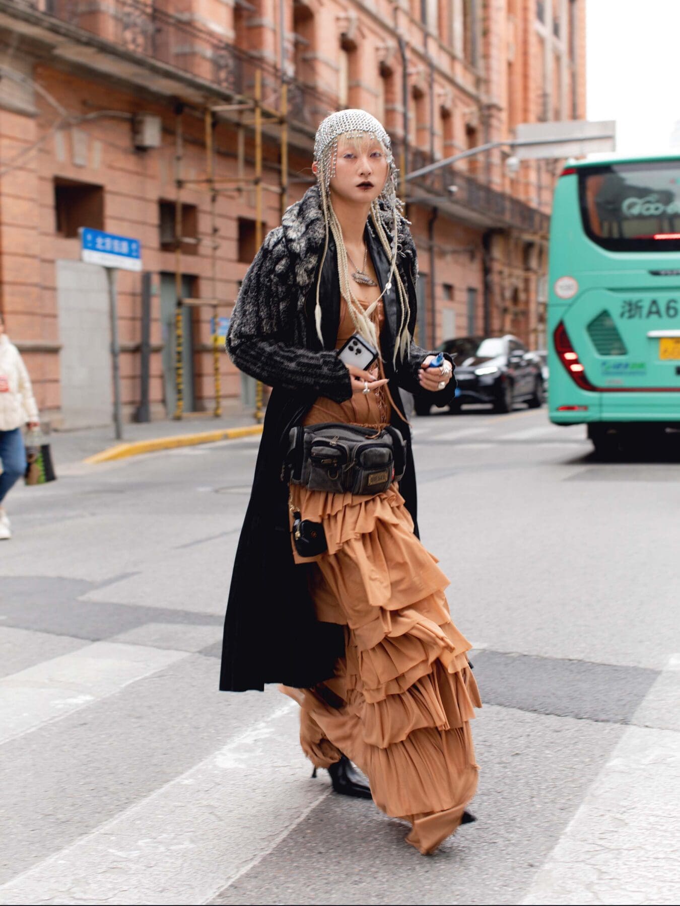 然而,真正體現風格變革的,往往不僅限於天橋,而是來自街頭的即興演繹。今季上海時裝週,隨着新中式風格的崛起,傳統設計語彙在現代剪裁中找到新的平衡點,而長襪、豹紋、皮革與毛毛元素的運用,則進一步豐富了造型的層次,構築出屬於上海的時尚敘事。