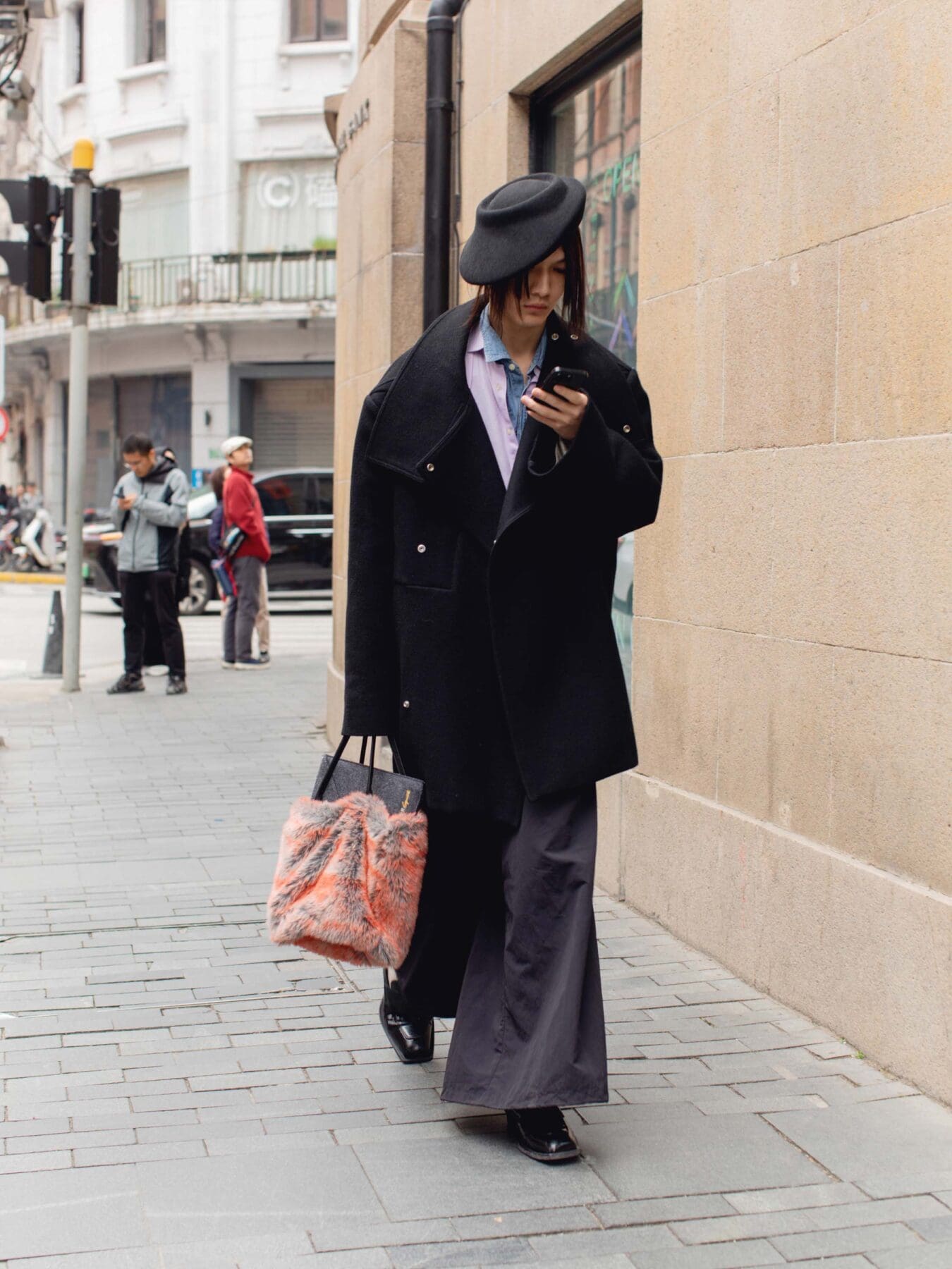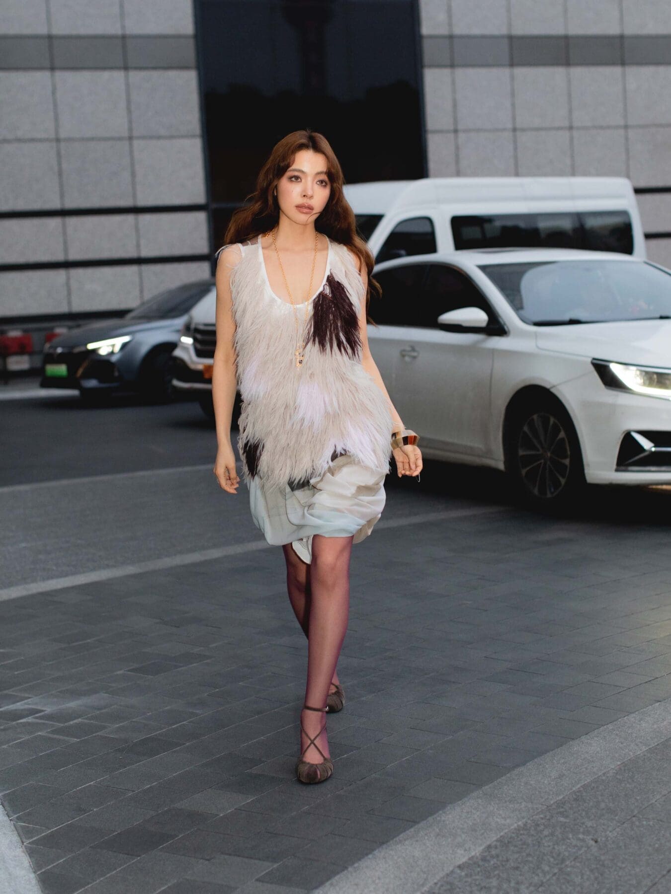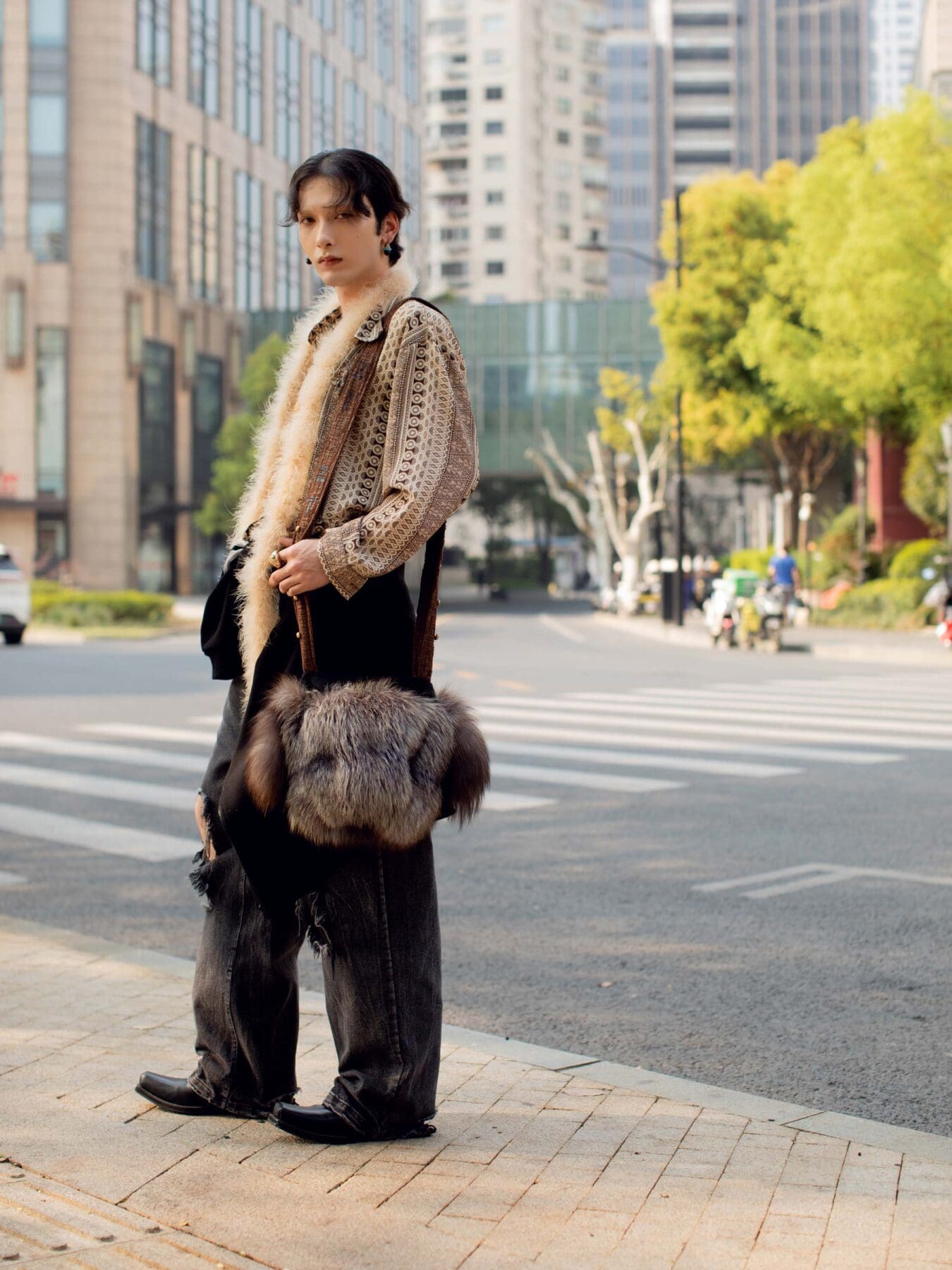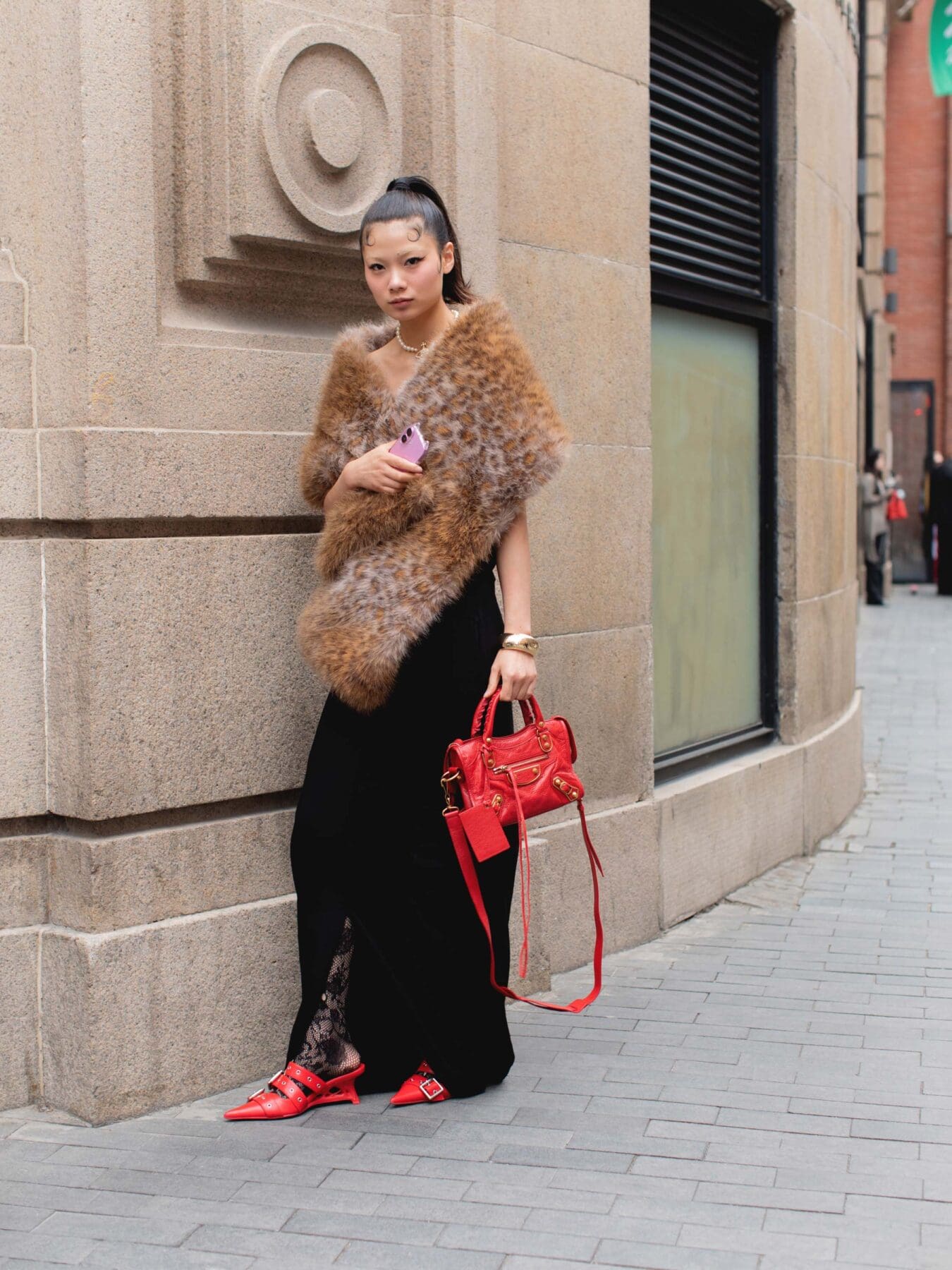 今季上海時裝週,毛毛元素不僅出現在經典的皮草大衣與披肩,亦成為配飾與細節設計的亮點。手袋、鞋履上的絨毛點綴,為極簡風格增添一絲柔和質感;而灰色套裝裙上覆蓋大面積紅色毛毛細節,則營造強烈的視覺對比。在上海時尚達人的演繹下,毛毛元素不再只是奢華的象徵,而是透過顏色與結構的巧妙運用,帶出Gen Z的時尚態度——既大膽,又不失玩味。