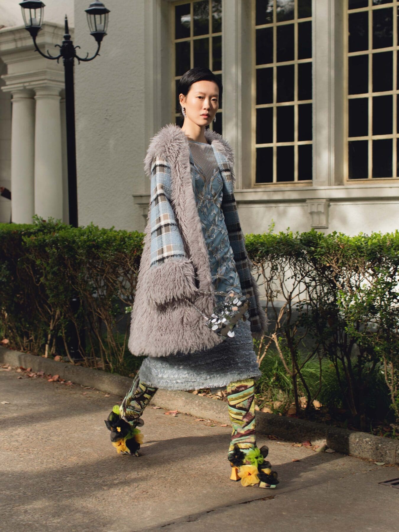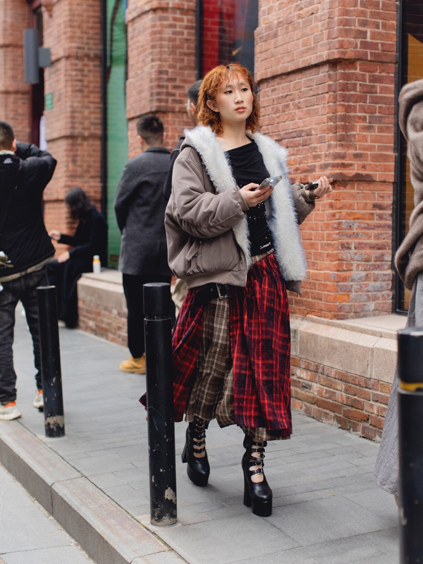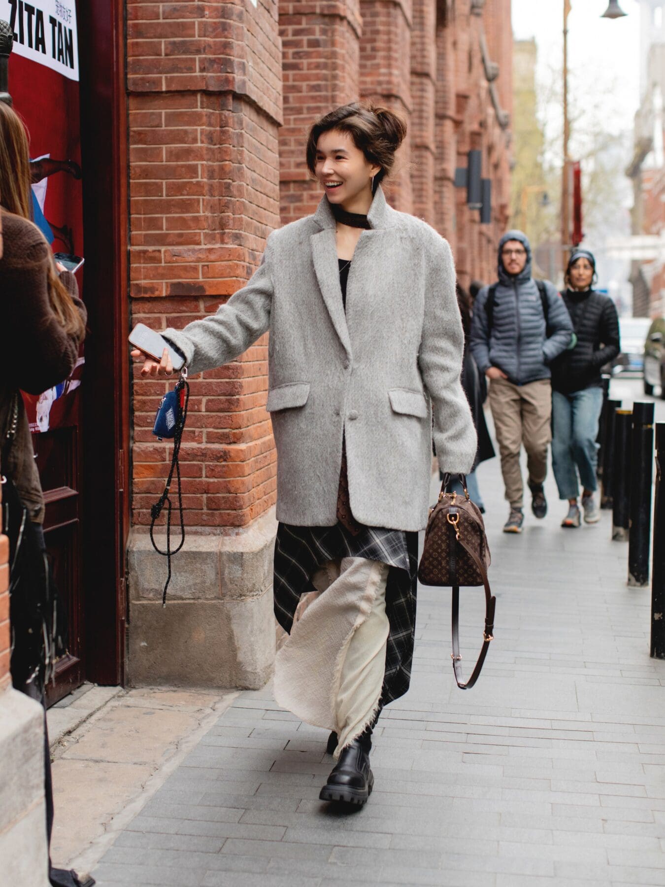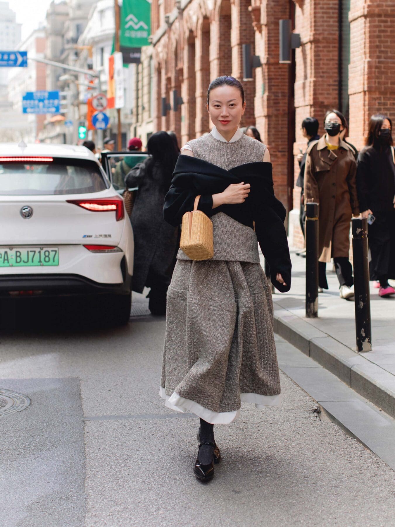 今季上海時裝週,毛毛元素不僅出現在經典的皮草大衣與披肩,亦成為配飾與細節設計的亮點。手袋、鞋履上的絨毛點綴,為極簡風格增添一絲柔和質感;而灰色套裝裙上覆蓋大面積紅色毛毛細節,則營造強烈的視覺對比。在上海時尚達人的演繹下,毛毛元素不再只是奢華的象徵,而是透過顏色與結構的巧妙運用,帶出Gen Z的時尚態度——既大膽,又不失玩味。