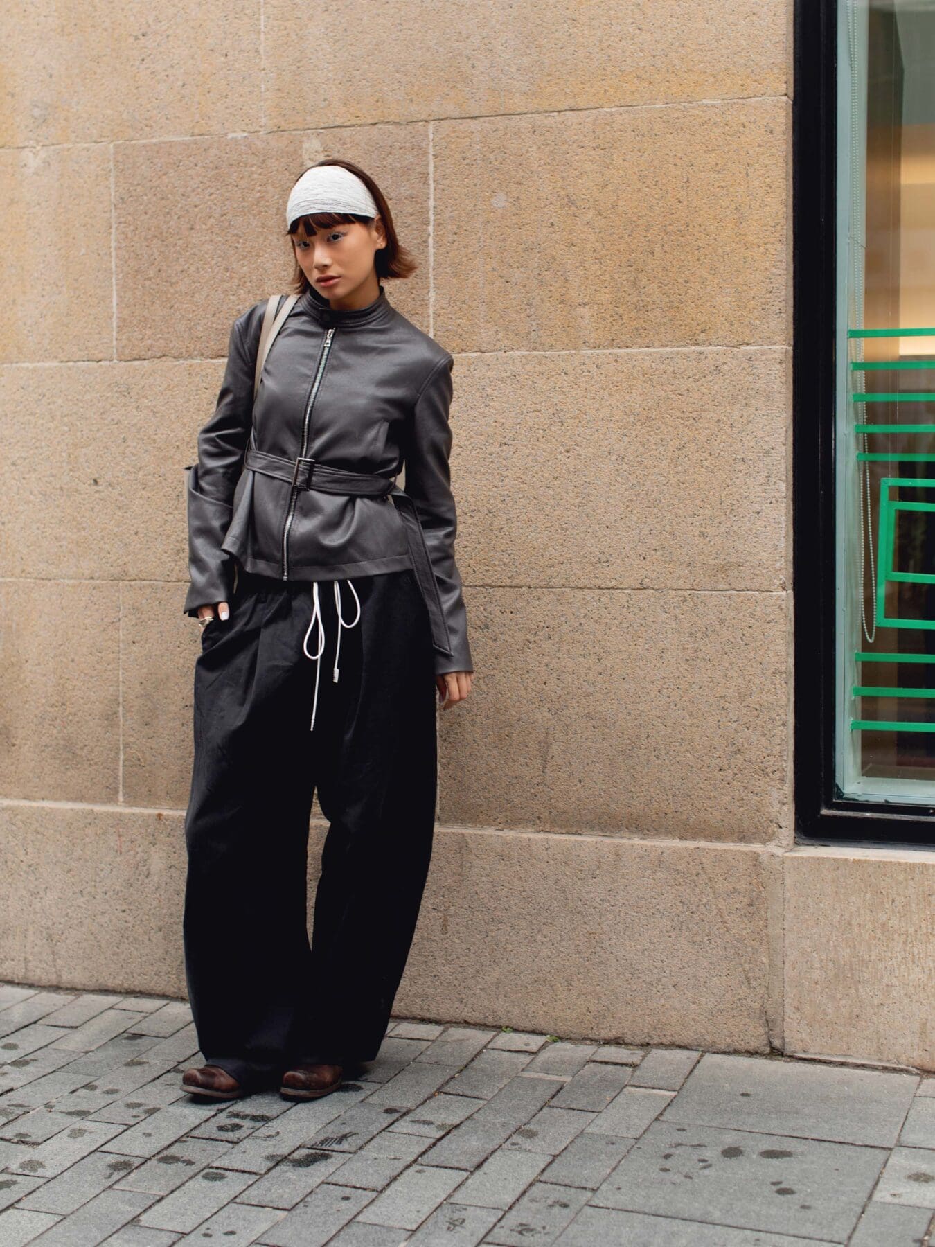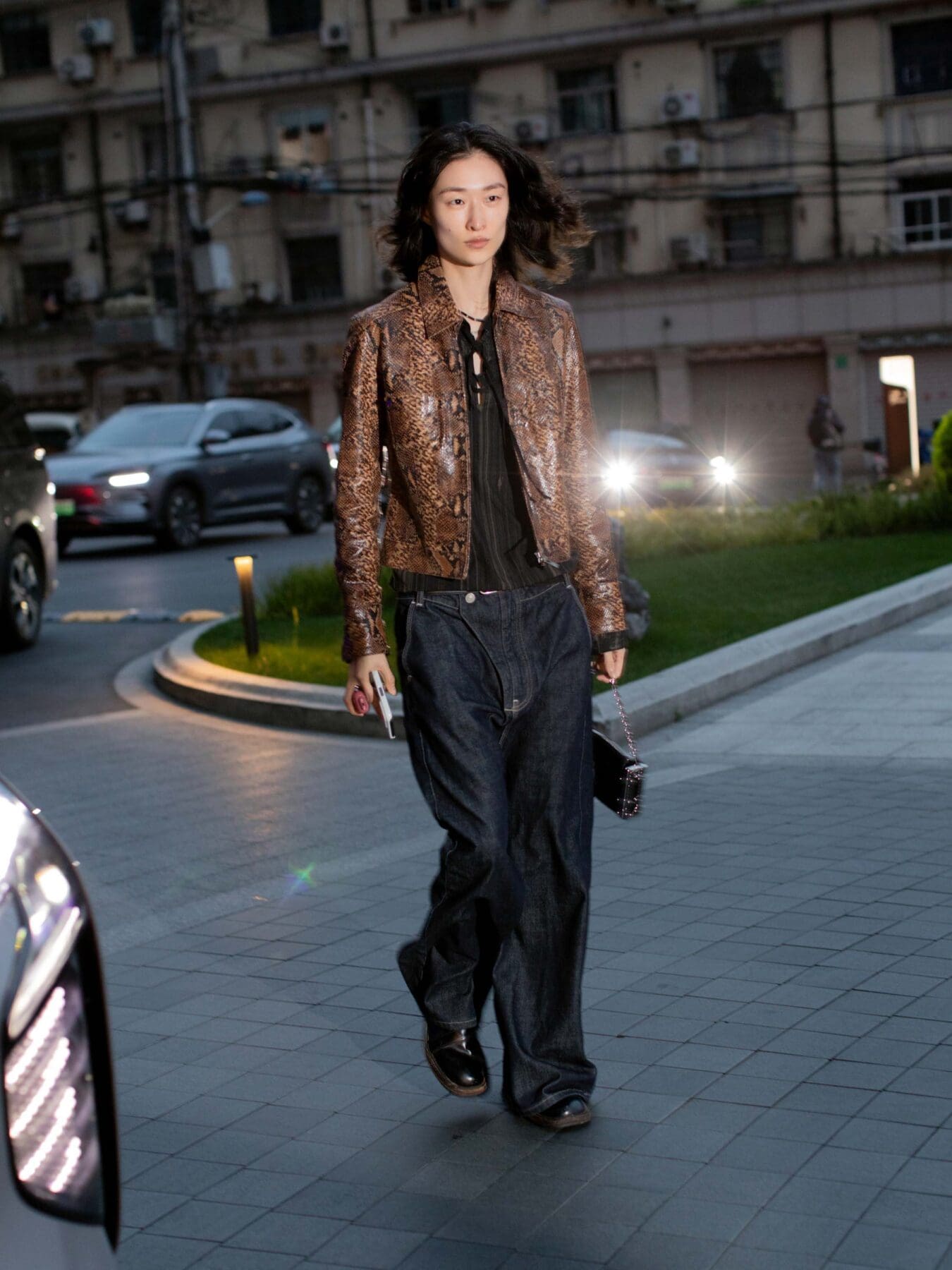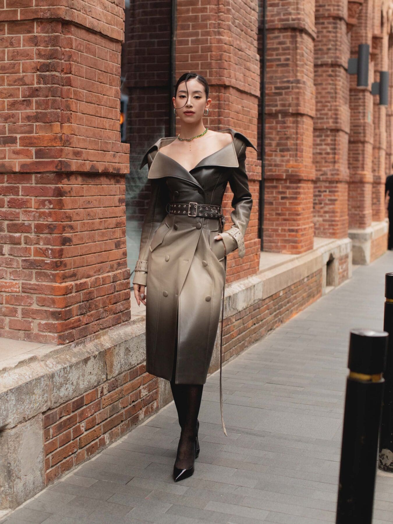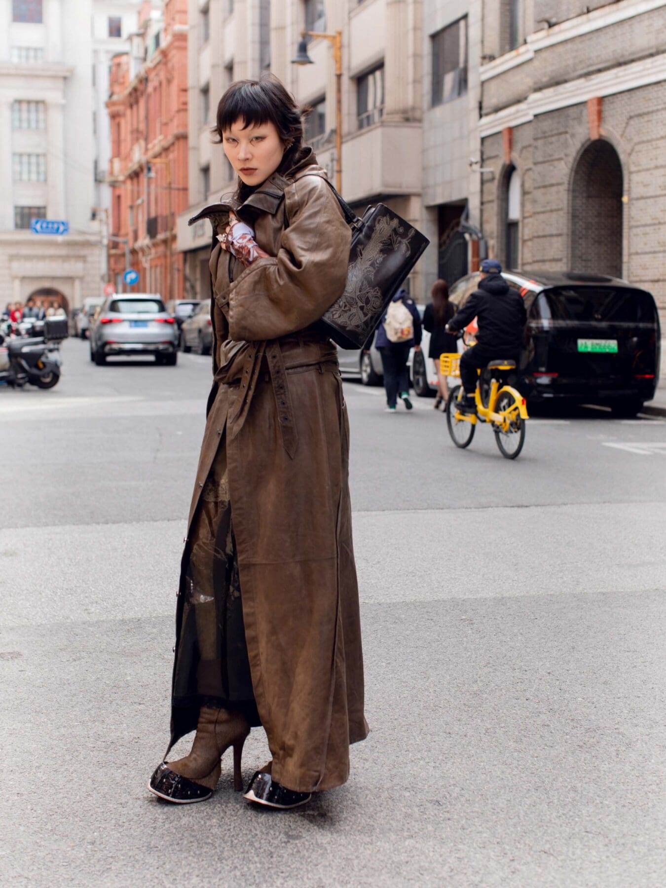 皮革向來是秋冬衣櫥的關鍵元素,而今季上海時裝週的街拍造型則更強調剪裁與結構感。長版皮革大衣營造強烈氣場,搭配寬褲或流線型裙裝,展現俐落輪廓;短版皮革外套則與Crop Top和高腰牛仔褲組合,突顯身形比例。此外,啡色皮革外套與幾何圖案毛衣的搭配,亦讓Preppy Style呈現更高級的視覺效果。本季的皮革趨勢不再只是關於「酷感」,而是藉由不同材質處理與搭配方式,塑造出更具層次的風格變化。
