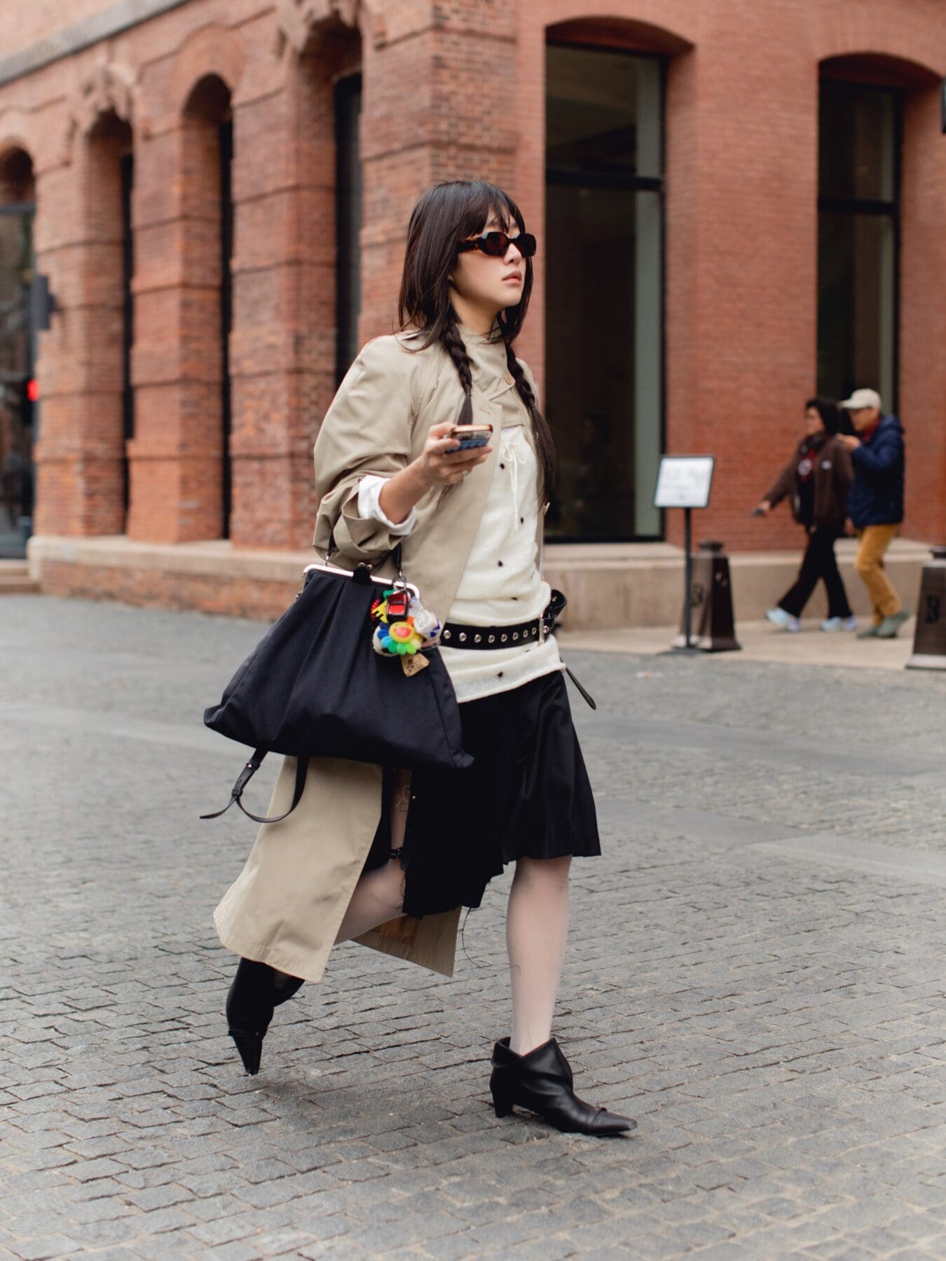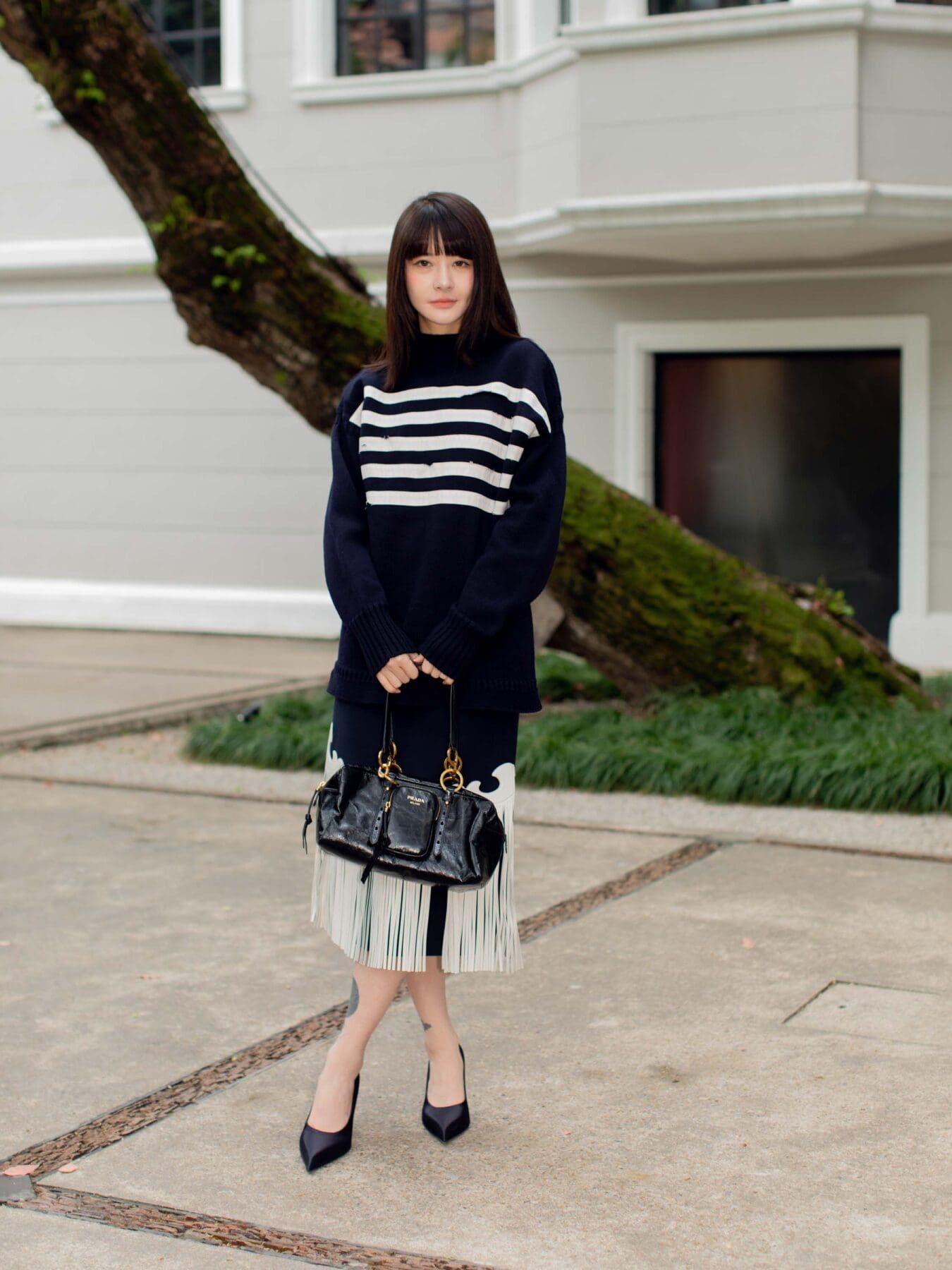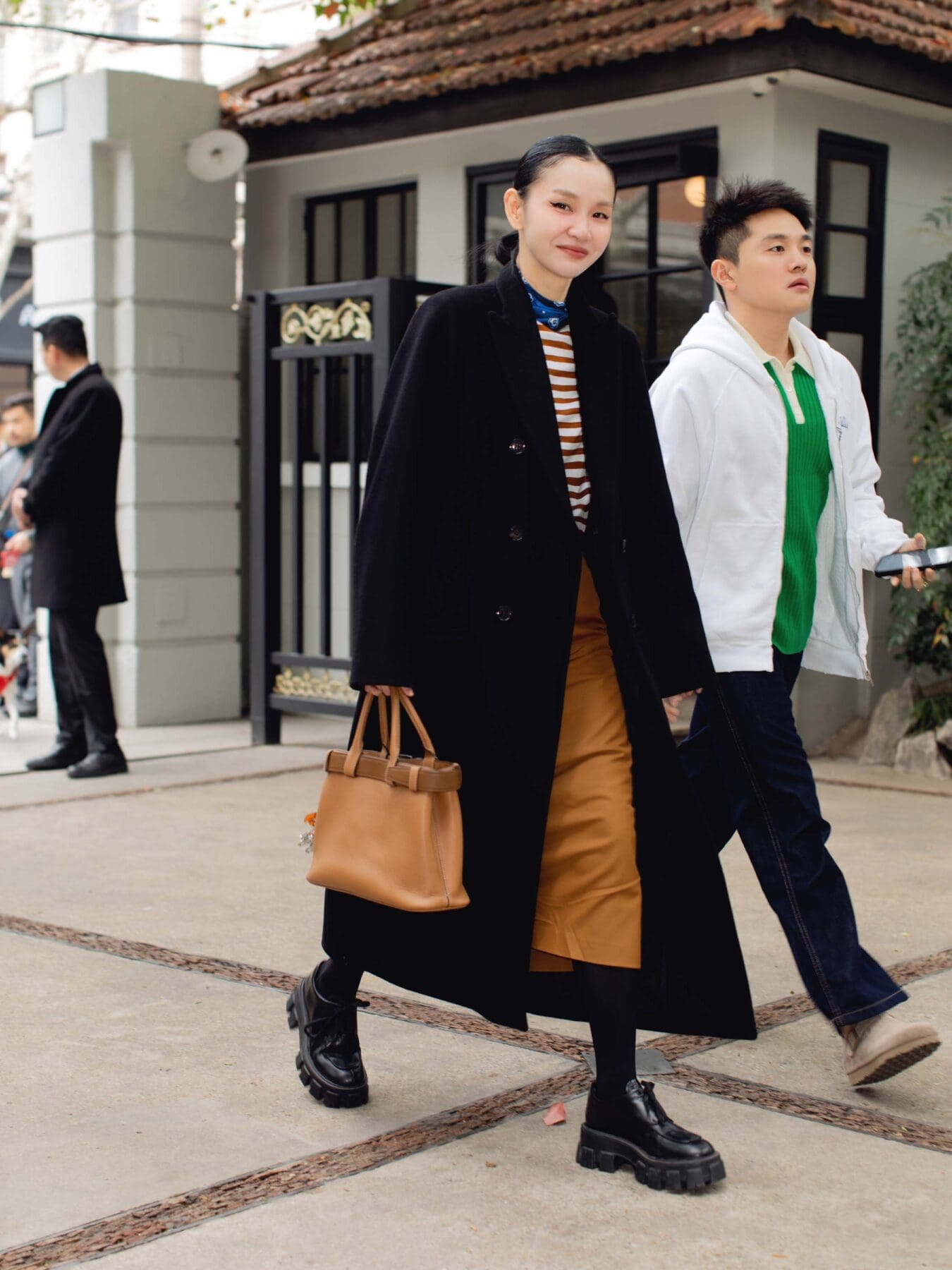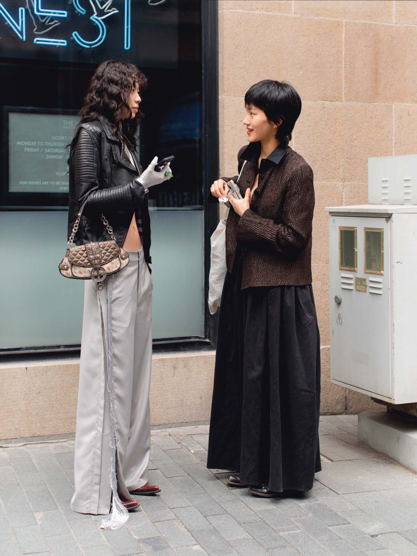 皮革向來是秋冬衣櫥的關鍵元素,而今季上海時裝週的街拍造型則更強調剪裁與結構感。長版皮革大衣營造強烈氣場,搭配寬褲或流線型裙裝,展現俐落輪廓;短版皮革外套則與Crop Top和高腰牛仔褲組合,突顯身形比例。此外,啡色皮革外套與幾何圖案毛衣的搭配,亦讓Preppy Style呈現更高級的視覺效果。本季的皮革趨勢不再只是關於「酷感」,而是藉由不同材質處理與搭配方式,塑造出更具層次的風格變化。