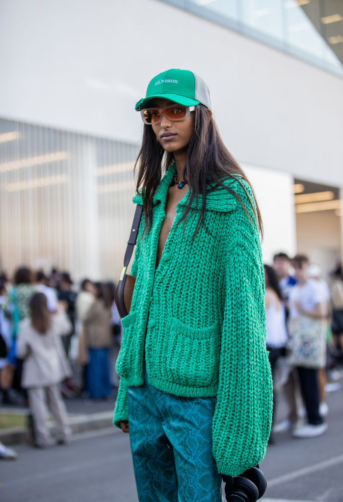 MILAN, ITALY - SEPTEMBER 24: Model Mona Tougaard seen wearing green cap, cardigan outside Prada during the Milan Fashion Week - Spring / Summer 2022 on September 24, 2021 in Milan, Italy. (Photo by Christian Vierig/Getty Images)