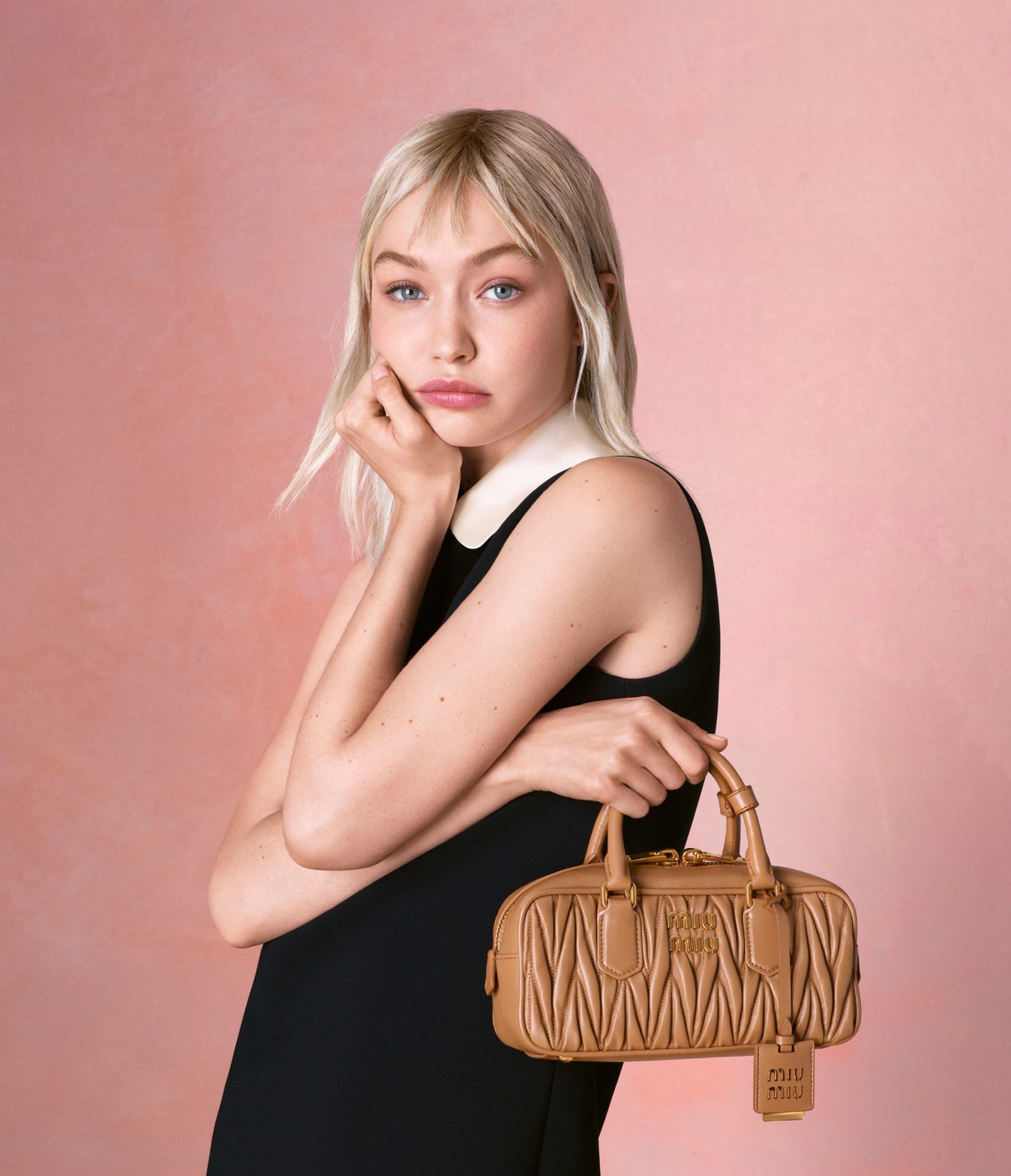 Gigi Hadid 驚喜亮相於 Miu Miu 的時尚廣告大片,為品牌的 Matelassé Wander 和 Arcadie 手袋作宣傳。Matelassé 的設計在 2006 年的秋季時裝展首次推出,發展至今已成為品牌標誌。色彩豐富的背景與造型設計與擁有獨特 Matelassé 皺摺花紋的手袋相得益彰,呈現出深紅色、米色、黑色與駝棕色手袋的的獨特魅力。