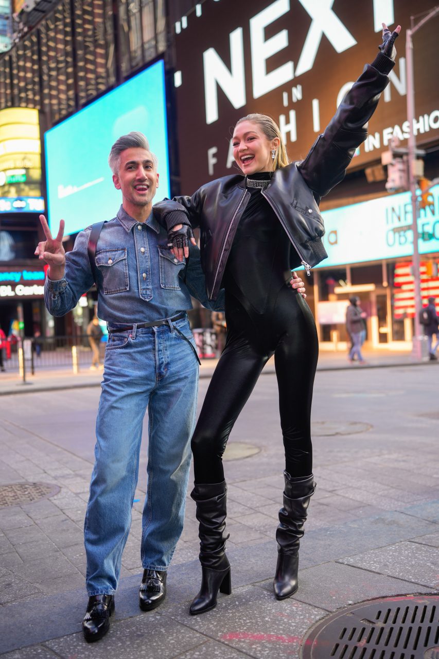 NEW YORK, NEW YORK - FEBRUARY 27: Gigi Hadid and Tan France poses for photos with the building of their show 'Next in Fashion' on February 27, 2023 in New York City. (Photo by Gotham/GC Images)