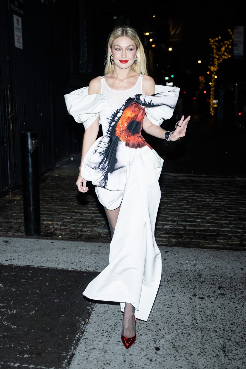 Gigi Hadid 以兩個強勢造型結束她這一天系:分別是在出席 Jimmy Fallon 節目時穿的 Alexandre Vauthier Couture 連帽皮外套及緊身褲;然後是 Alexander McQueen 2023 年春夏的垂墜「眼睛」連衣裙——它令人印象深刻。一天內換足六套衣服,但有六種完全不同的感覺?這便是 Gigi Hadid 特有的天賦。