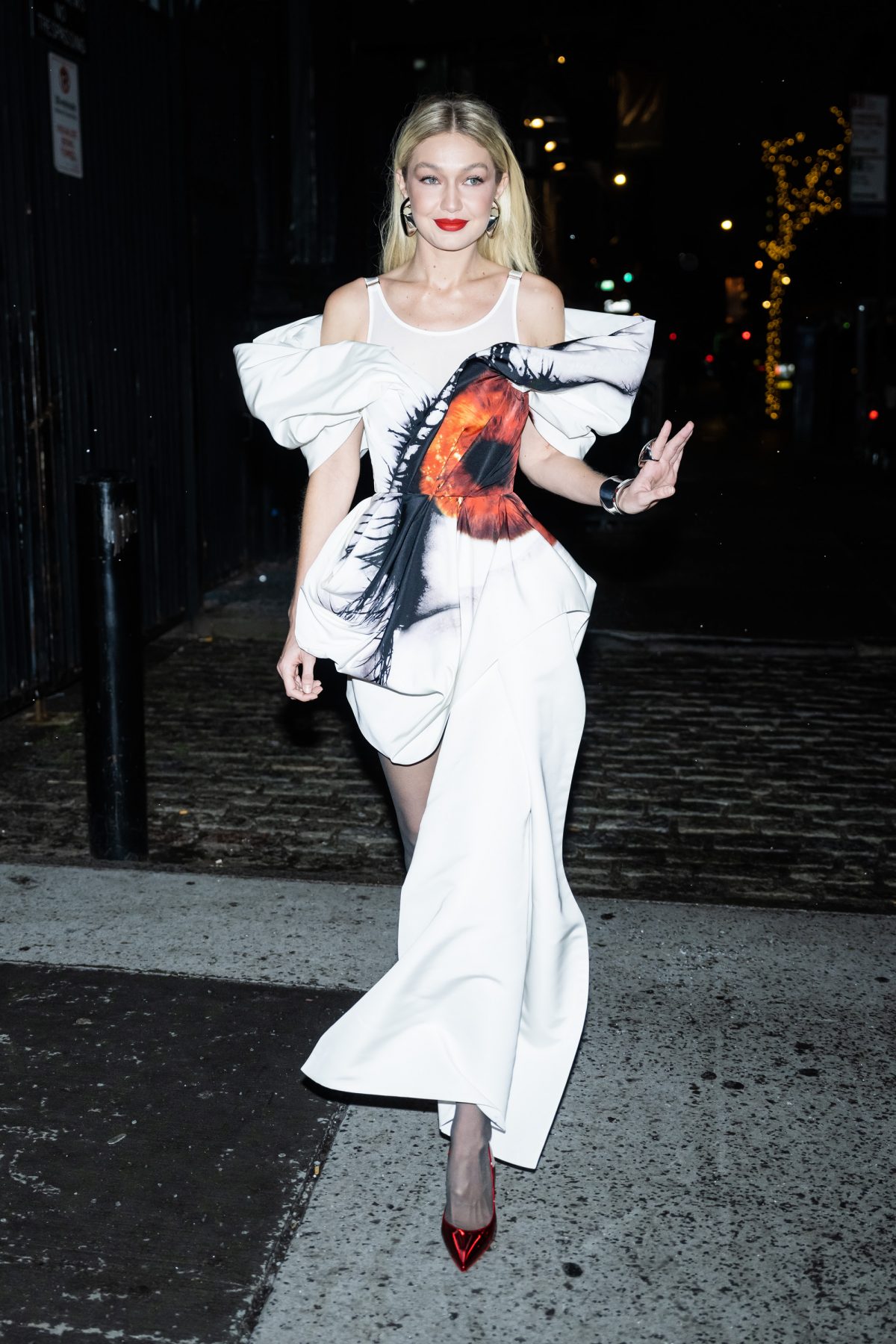 Gigi Hadid 以兩個強勢造型結束她這一天系:分別是在出席 Jimmy Fallon 節目時穿的 Alexandre Vauthier Couture 連帽皮外套及緊身褲;然後是 Alexander McQueen 2023 年春夏的垂墜「眼睛」連衣裙——它令人印象深刻。一天內換足六套衣服,但有六種完全不同的感覺?這便是 Gigi Hadid 特有的天賦。