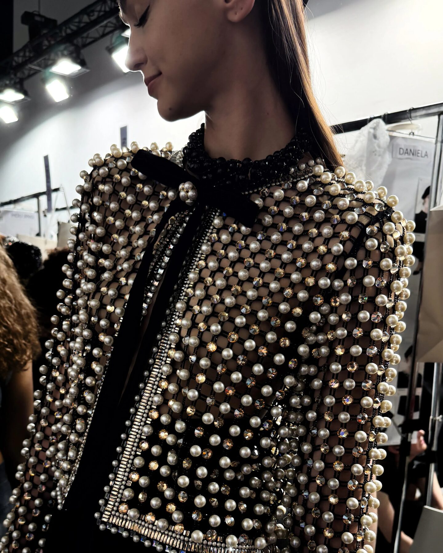 在樓下,團隊顯得有條不紊且從容不迫:畢竟,在這場名為“Giorgio Armani Privé 2005-2025,高級訂製二十週年”的展覽於正式開幕之前,90% 的工作已經完成。在 Silos 寬敞的中庭中心位置,擺放着一件 2019 年秋冬系列的露肩蓬裙禮服,這件禮服就在上週由 Irina Shayk 穿著,亮相於康城影展的開幕式。它層疊的白色針點表面點綴在深邃的黑色之上,恰好映襯了我們周圍高聳牆壁上投射出的抽象星空圖景。
