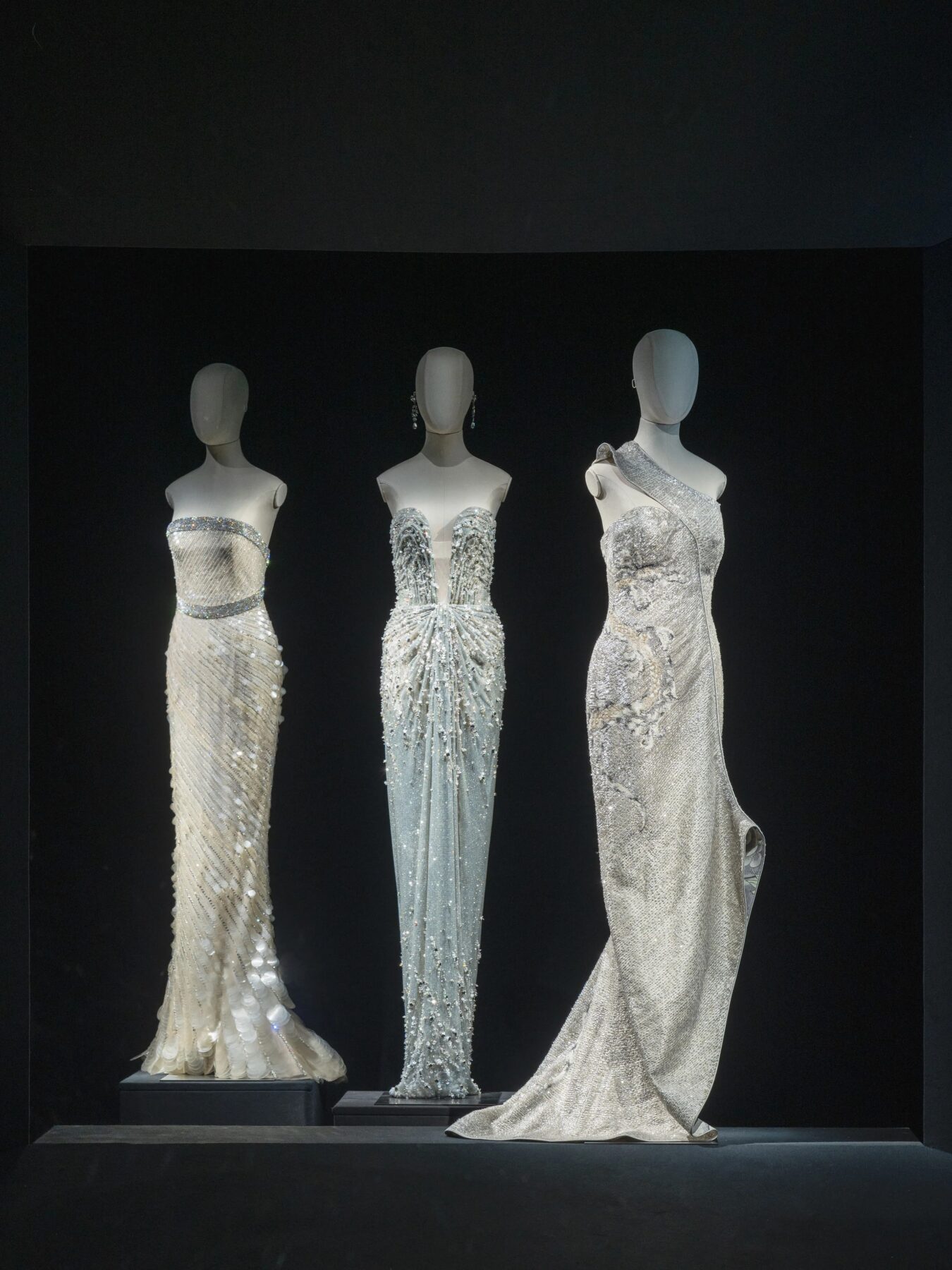 我們繼續深入展覽,迎面而來的是三套服裝的三聯畫:一件長款外套、一件月牙肩設計的長禮服,以及另一件露肩裙,這件裙子配有戲劇性斜裁的裙擺。這三件全都採用奶油色絲綢和亮片製成,置於一個新月背景之下:即使是最遲鈍的觀眾,也能感受到展覽中的晚禮服主題正在逐漸浮現。這些造型來自 2008 年秋冬系列和 2010 年春夏系列:展覽以設計風格的共通性而非時間順序來分組展示,成為本次展覽的另一個主題。