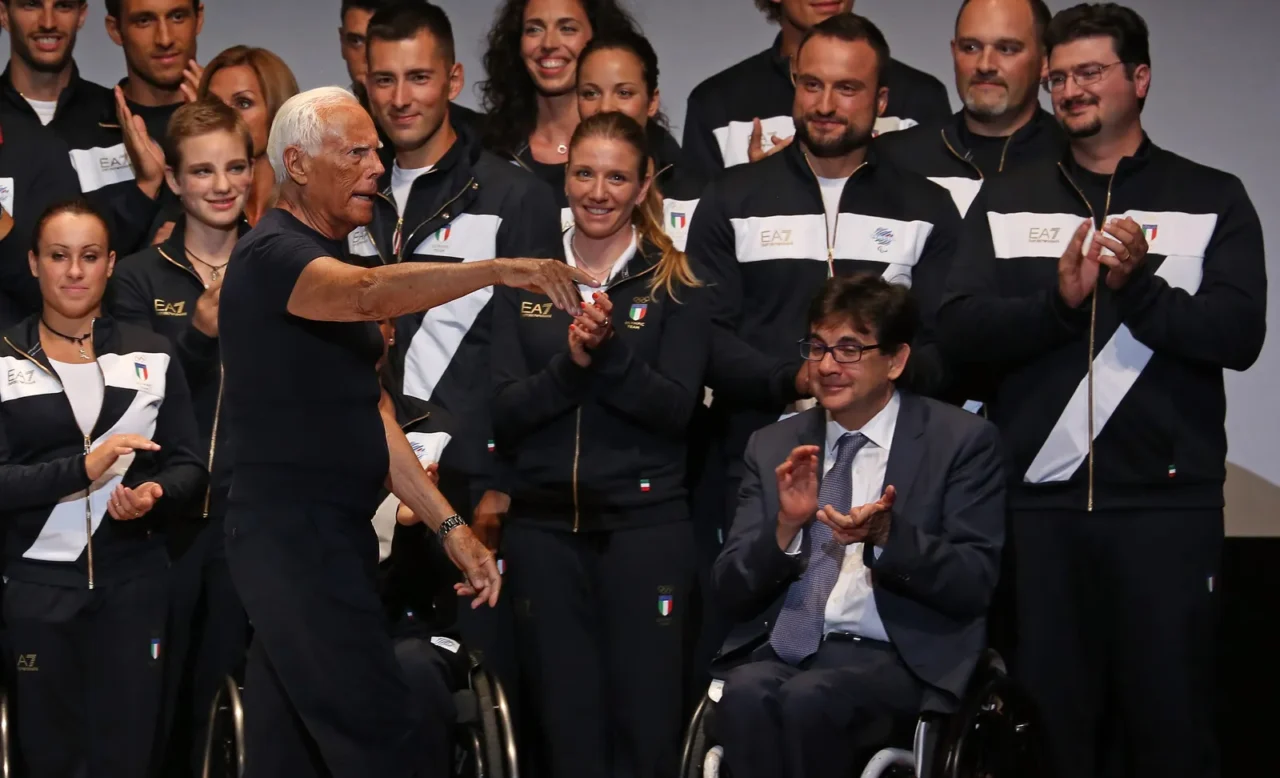 Giorgio Armani and Luca Pancalli during the presentation of the uniform designed by Giorgio Armani for the Rio 2016 Olympics. (Vincenzo Lombardo/Getty Images)