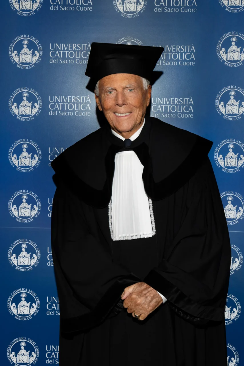 2023年, Giorgio Armani回到家鄉皮亞琴察(Piacenza),接受聖心天主教大學頒發的全球商業管理榮譽學位。他在頒獎禮表示:「這個榮譽對我意義重大,因為它認可了我作為企業家的角色、我的承諾和熱情,還有它在我心愛的故鄉頒發的——那是一個小時候令我著迷的神奇地方。」