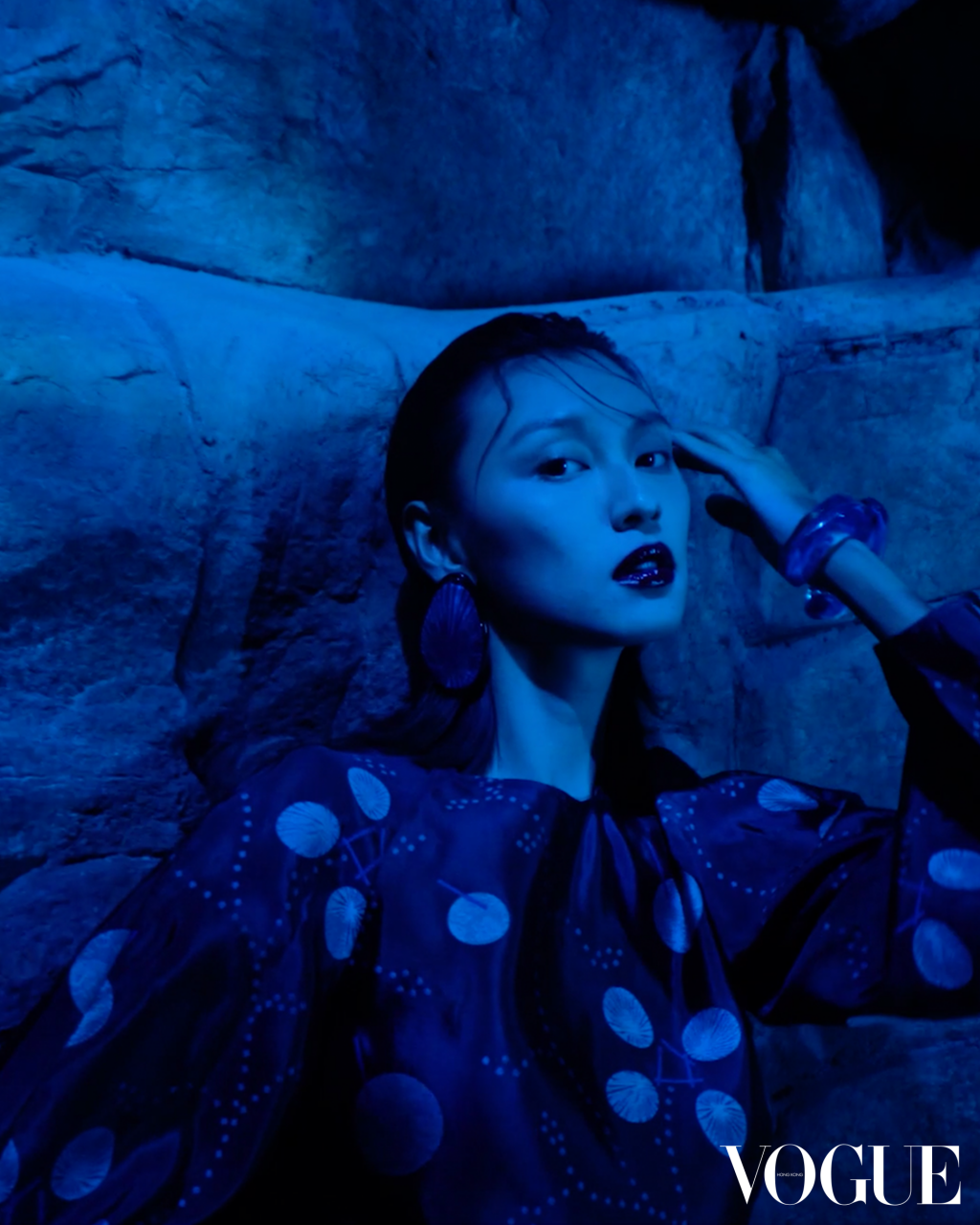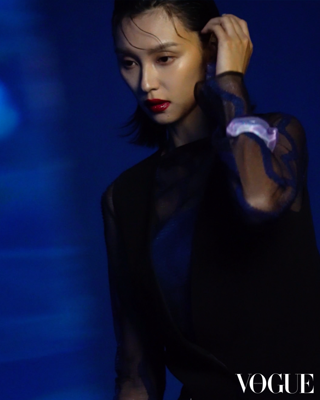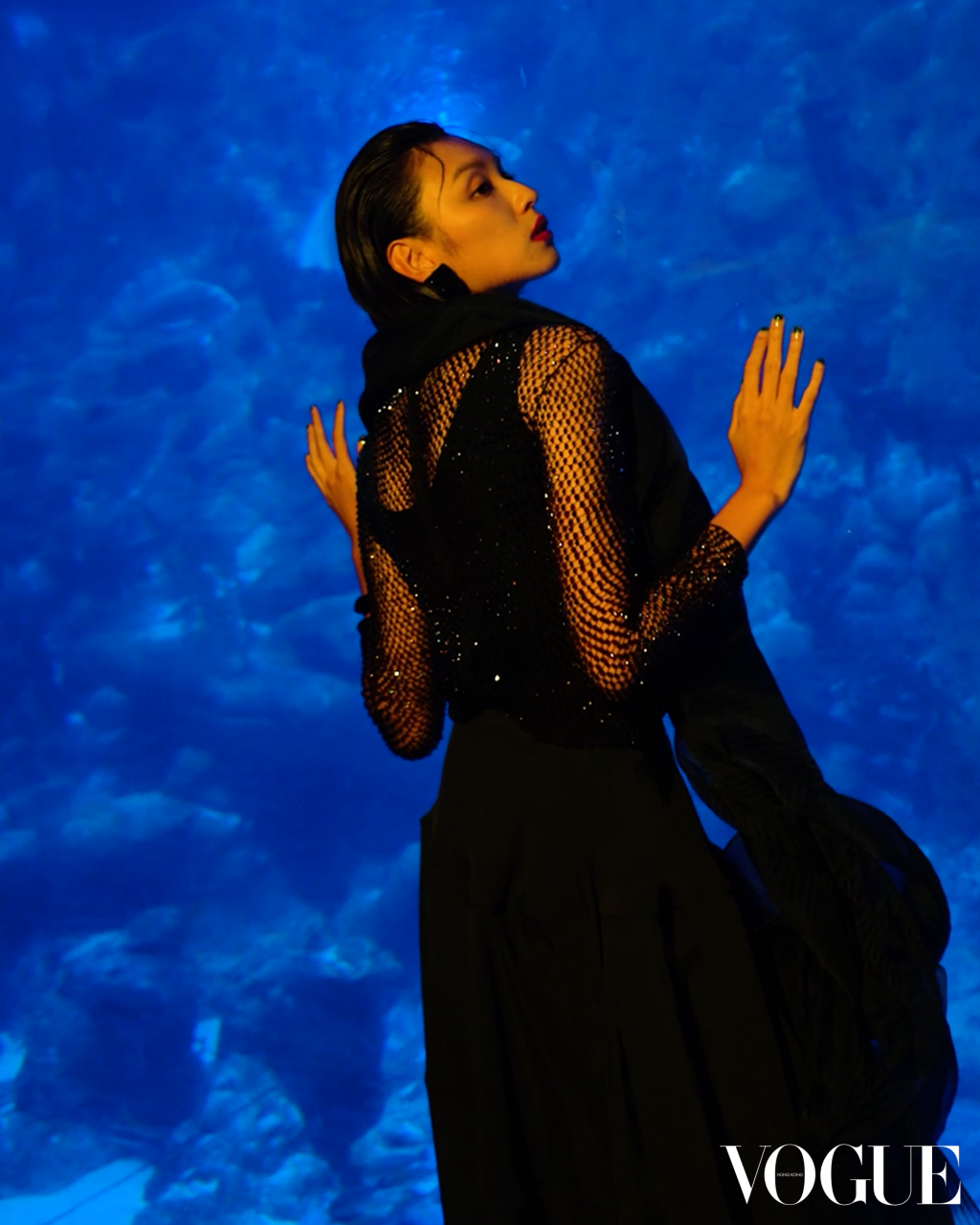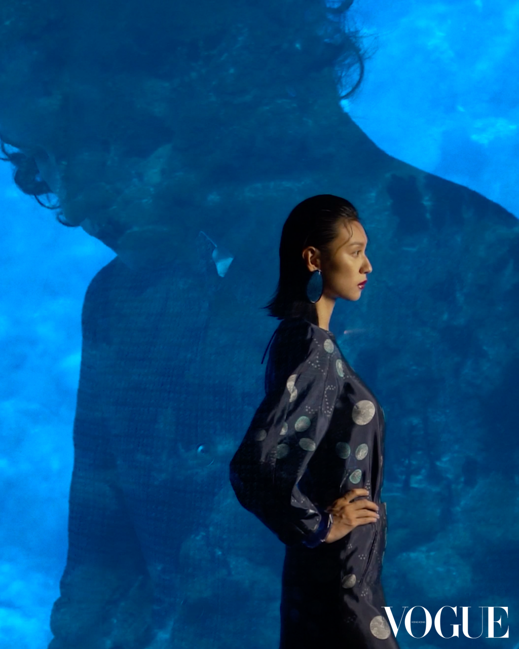今次 Louise 潛入水中,模擬與海洋生物共舞,無不形象化地呈現出“Nocturnal”夜間舞動的主題,從標誌性的幽藍色調到星形花序圖案亦神秘莫測,更表現出 Giorgio Armani 對永續時尚的概念,呼應出時裝展上由姐姐送贈的藝術家 Marcantonio Malerba 1.47米高綠色大猩猩 Uri 裝置雕塑,「我決定將它放在本時裝展的中心,因為我認為現在比以往任何時候都更為重要,提醒人們保護自然世界。」