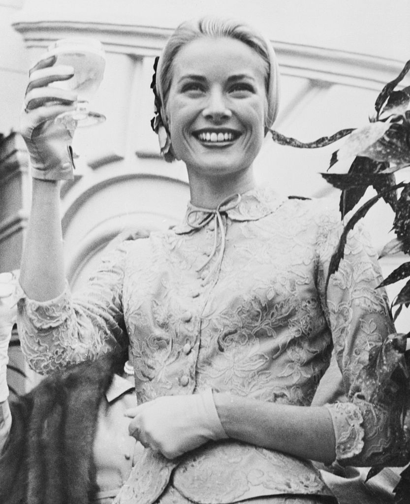 (Original Caption) Princess Grace Toasts Wedding Guests. Monte Carlo, Monaco: Just brimming over with happiness, Princess Grace holds up her glass to toast the guests at the garden party that followed her civil wedding to Prince Rainier on Wednesday. The party was held on palace grounds. Yesterday, Grace and the Prince were wed in a brilliant Roman Catholic ceremony in Monaco Cathedral. April 20, 1956.
