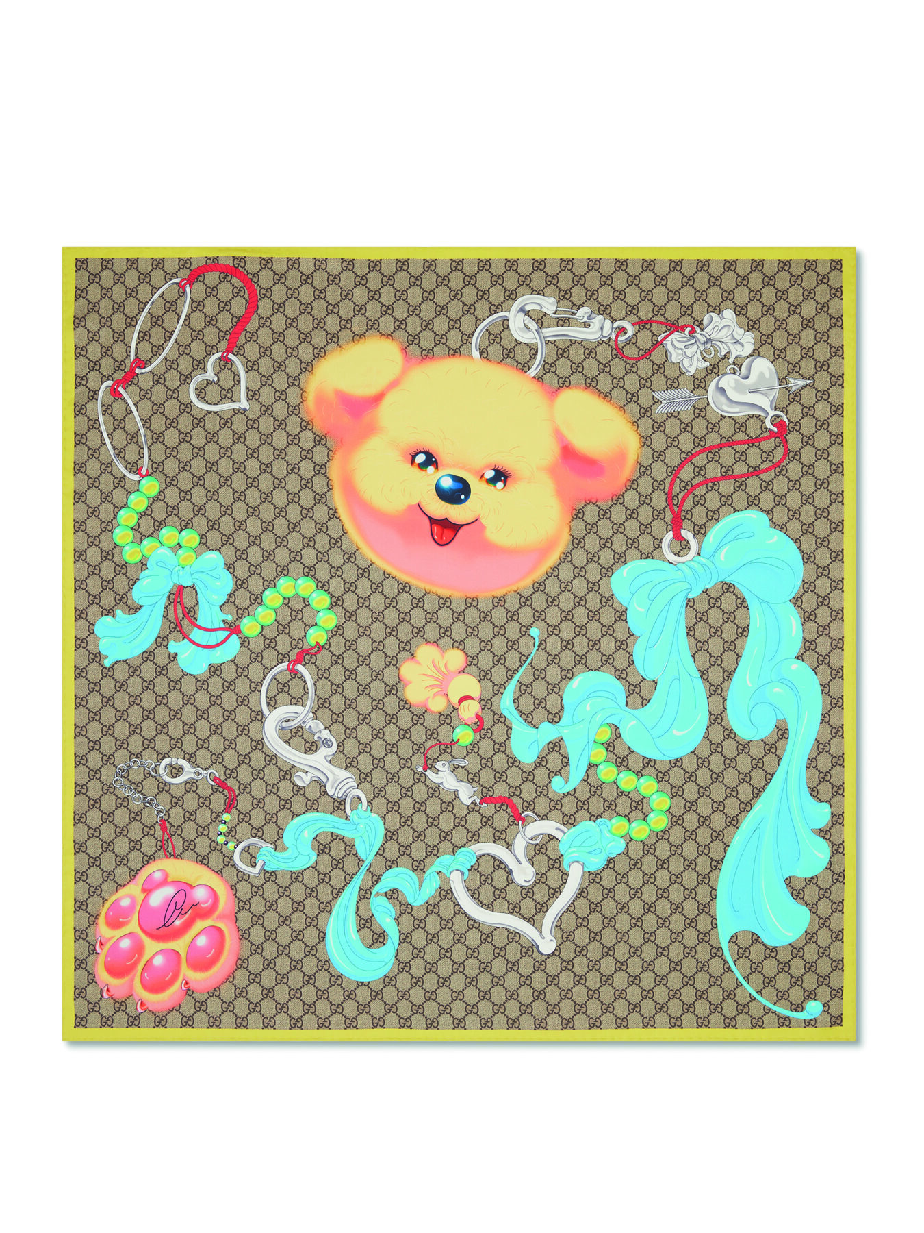 首爾藝術家Inji Seo喜歡透過動畫及插畫,探索流行文化和藝術的交集。她的作品充滿親和力,卻不失深度,今次她為Gucci設計的絲巾之一以可愛的小熊圖案,為優雅的GG Monogram注入活力。