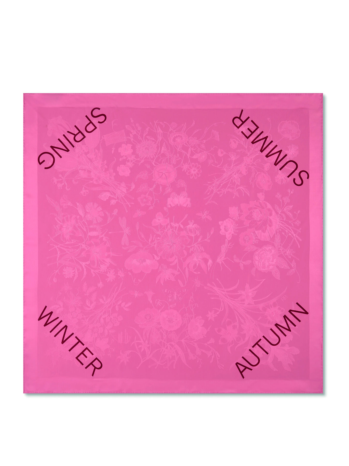 美國藝術家Robert Barry被公認為概念藝術先驅,他從1960年代中開始以無線電波、通靈及演示為媒介,探索非物質和稍縱即逝的事物,1970年代則將焦點轉移至語言。這款絲巾以隱晦的方式呈現花卉圖案,並以文字展示四季的名字。