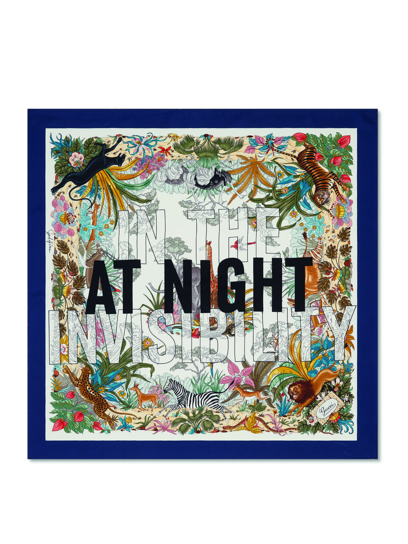 獨立藝術家Sara Leghissa的作品經常顛覆常規,創造以關懷、互助和自決為出發點的集體體驗。她在絲巾加入「At Night In The Invisibility」字樣,靈感源自黑暗中的帶領我們前進的聲音。