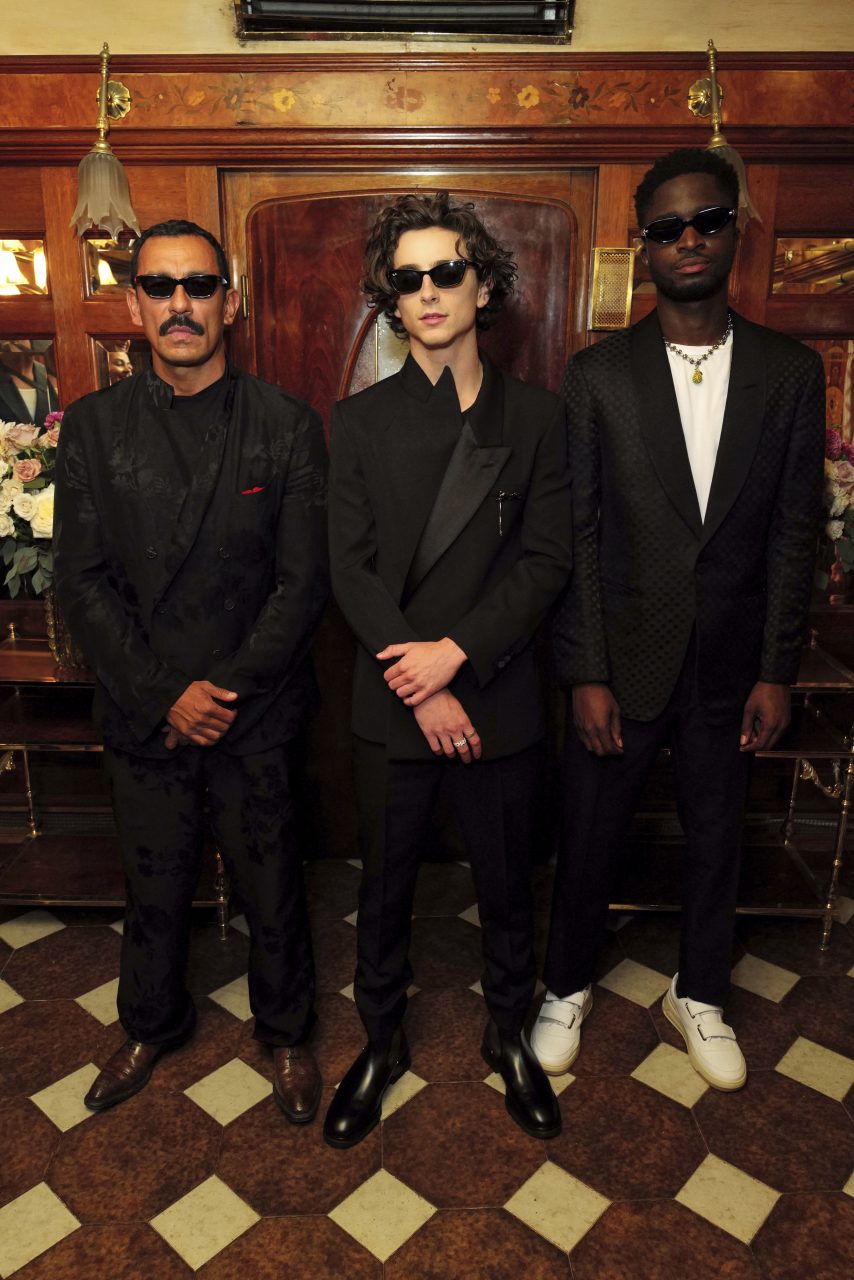 VENICE, ITALY - SEPTEMBER 03: Haider Ackermann, Timothée Chalamet and Stéphane Bak attend the British Vogue Celebrates Vogue Darlings party at Venice Film Festival in partnership with Cartier on September 03, 2022 in Venice, Italy. (Photo by Darren Gerrish/WireImage for Vogue)