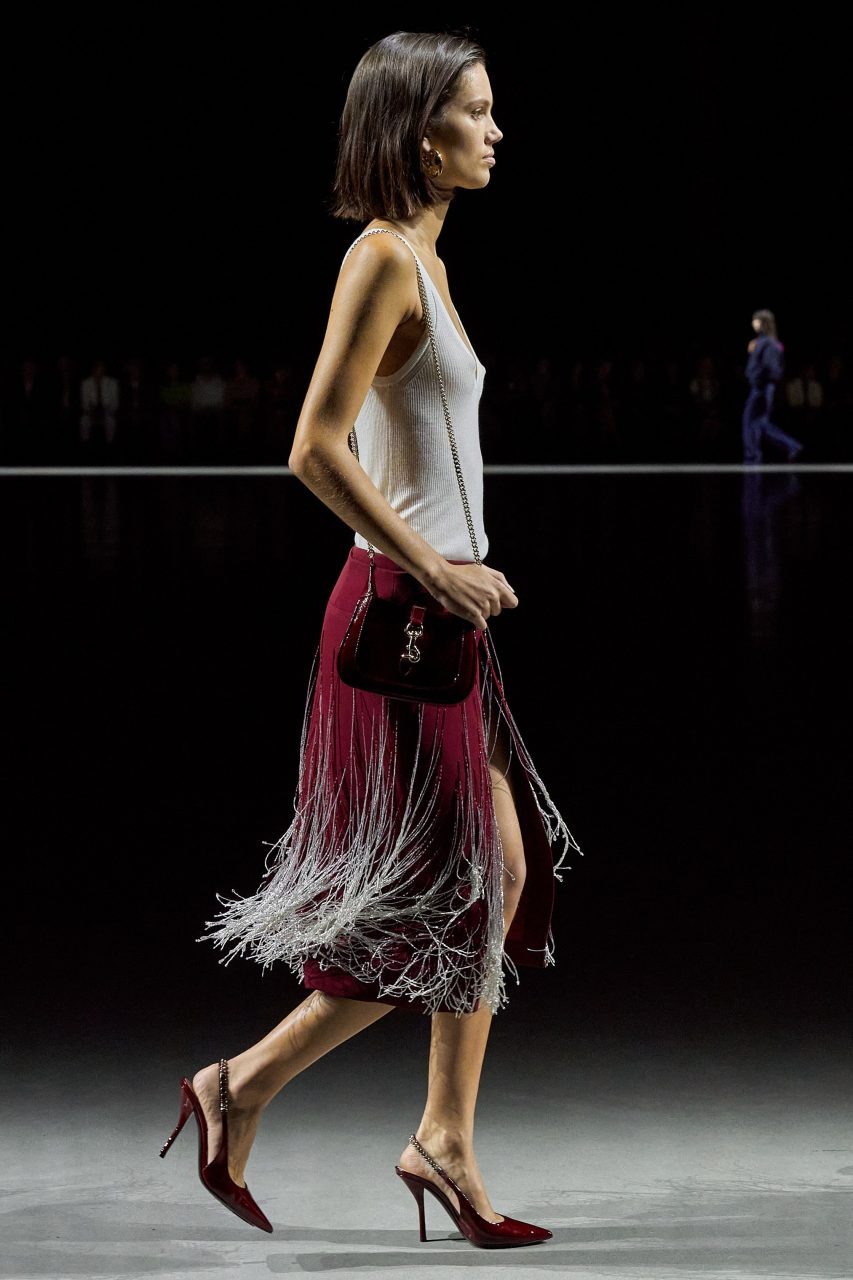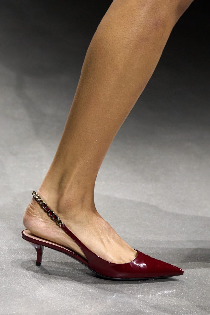 這雙高跟鞋在 Gucci 新任創意總監 Sabato de Sarno 剛剛在上月發布的 2024 年春夏系列Gucci Ancora 上首次亮相,它採用以標誌性的 Gucci Rosso Ancora 紅色漆皮製成,後方則配有精緻的金屬鏈條細節,完美展示了一種品牌全新確立的精緻奢華風格。