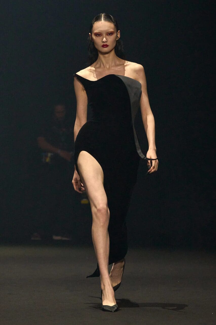 在Mugler 2024秋冬系列時裝展上,作為品牌常客的賀聰以性感瀟灑的姿態壓軸登場。帷幕落下,煙霧升起,純白與漆黑交替,賀聰身穿紅妝黑裙,彷彿從暗夜中走出的冷豔女殺手,神秘而充滿力量。裙裝的開衩設計與鋒利線條相得益彰,將品牌的大膽前衛風格全然綻現。