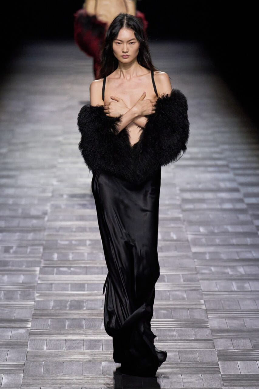 Ann Demeulemeester 2023 秋冬系列時裝展的話題度高居不下,賀聰在天橋上以一身近乎半裸的緞面黑色長裙出場,她雙手環抱着胸部,裙裝上的羽毛隨着行走而擺動,宛若一位赴約神秘派對的女子,危險而性感。