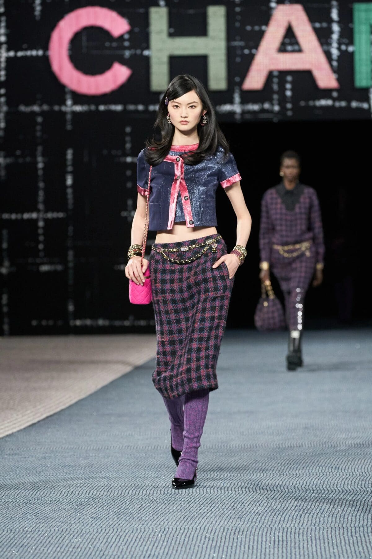 賀聰在Chanel 2022秋冬系列時裝展中,化身精緻的芭比,側分瀏海更增添了幾分東方美韻。她身穿Chanel藍色短款上衣,衣襟處飾以粉色線條,搭配蘇格蘭格紋半身裙和紫色小腿襪,將少女氣質與品牌的優雅經典巧妙融合。