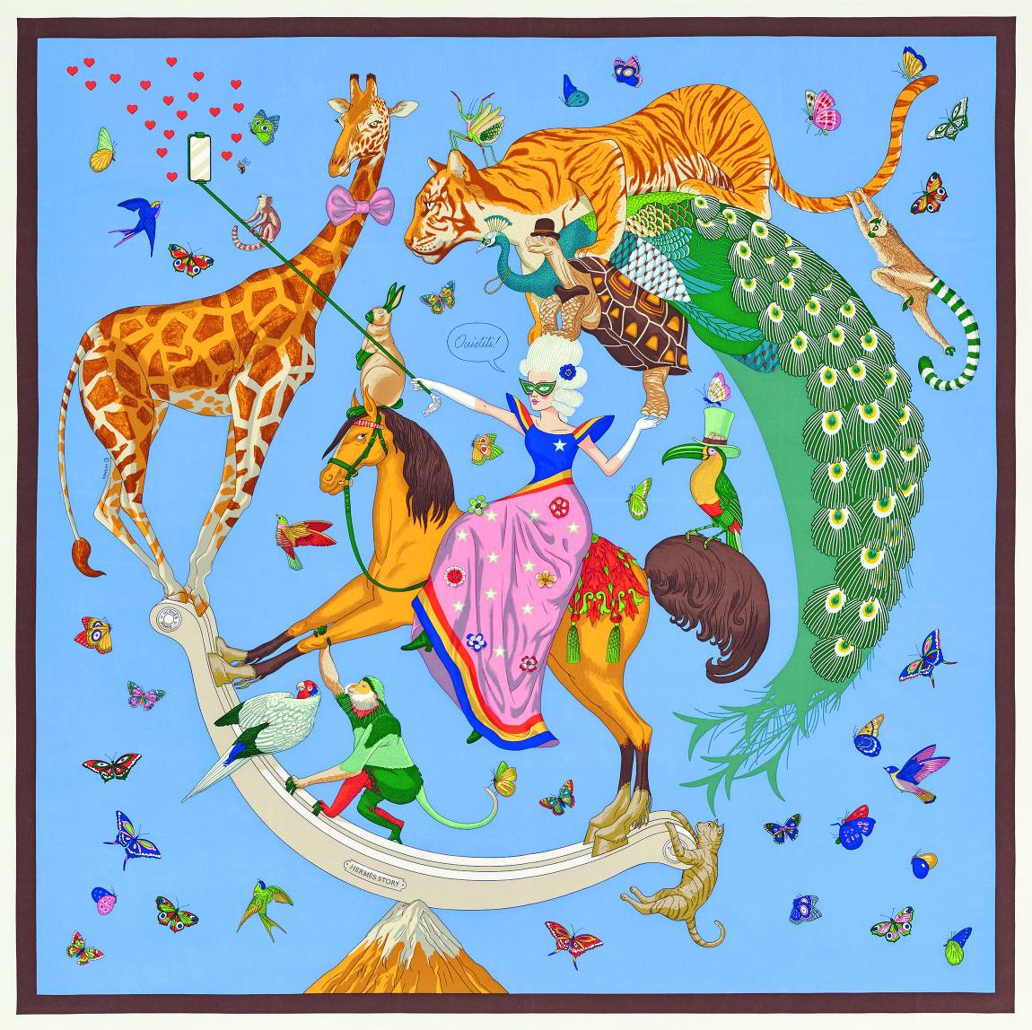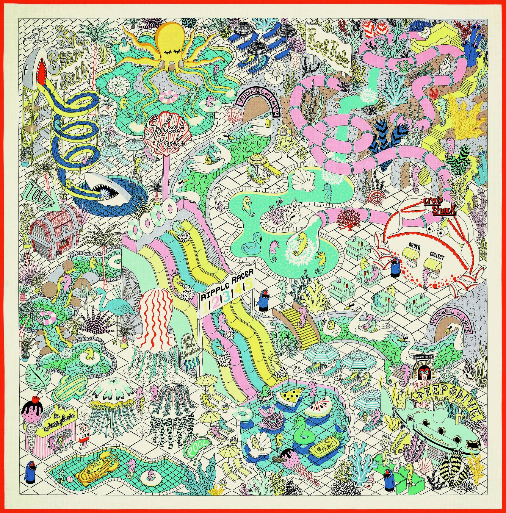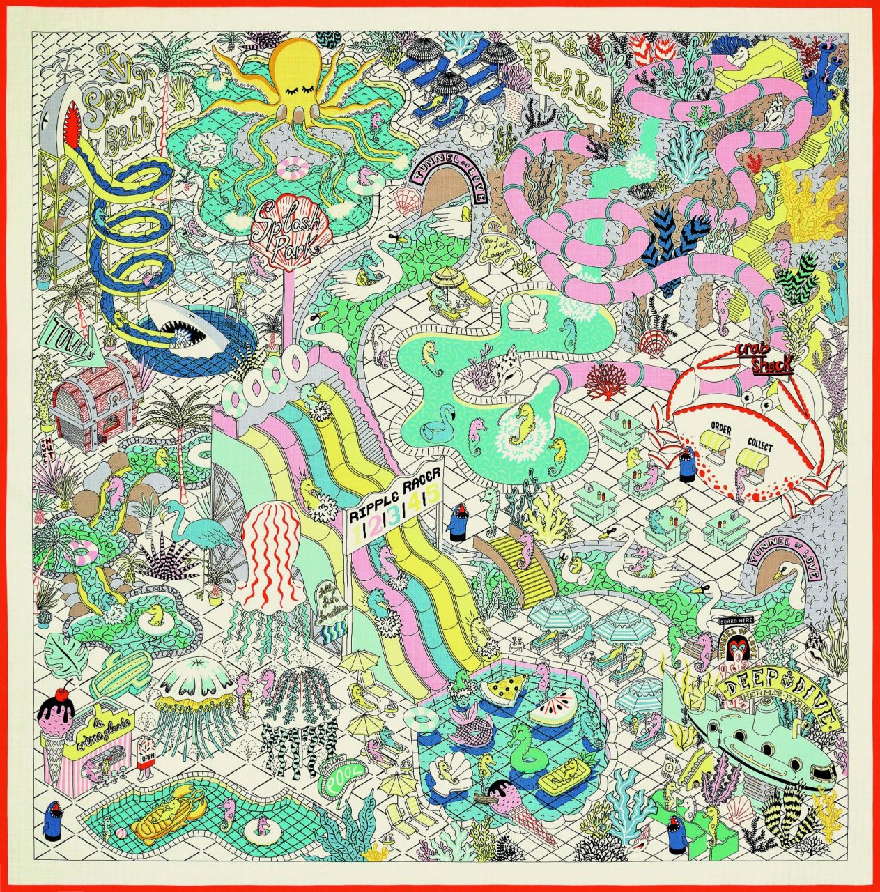 英國插畫家 Jacqueline Colley 是愛馬仕國際絲巾設計大賽的六位得獎者之一,獲頒幽默獎,她創作的遊樂場充滿童趣,讓各種奇幻生物樂而忘返。