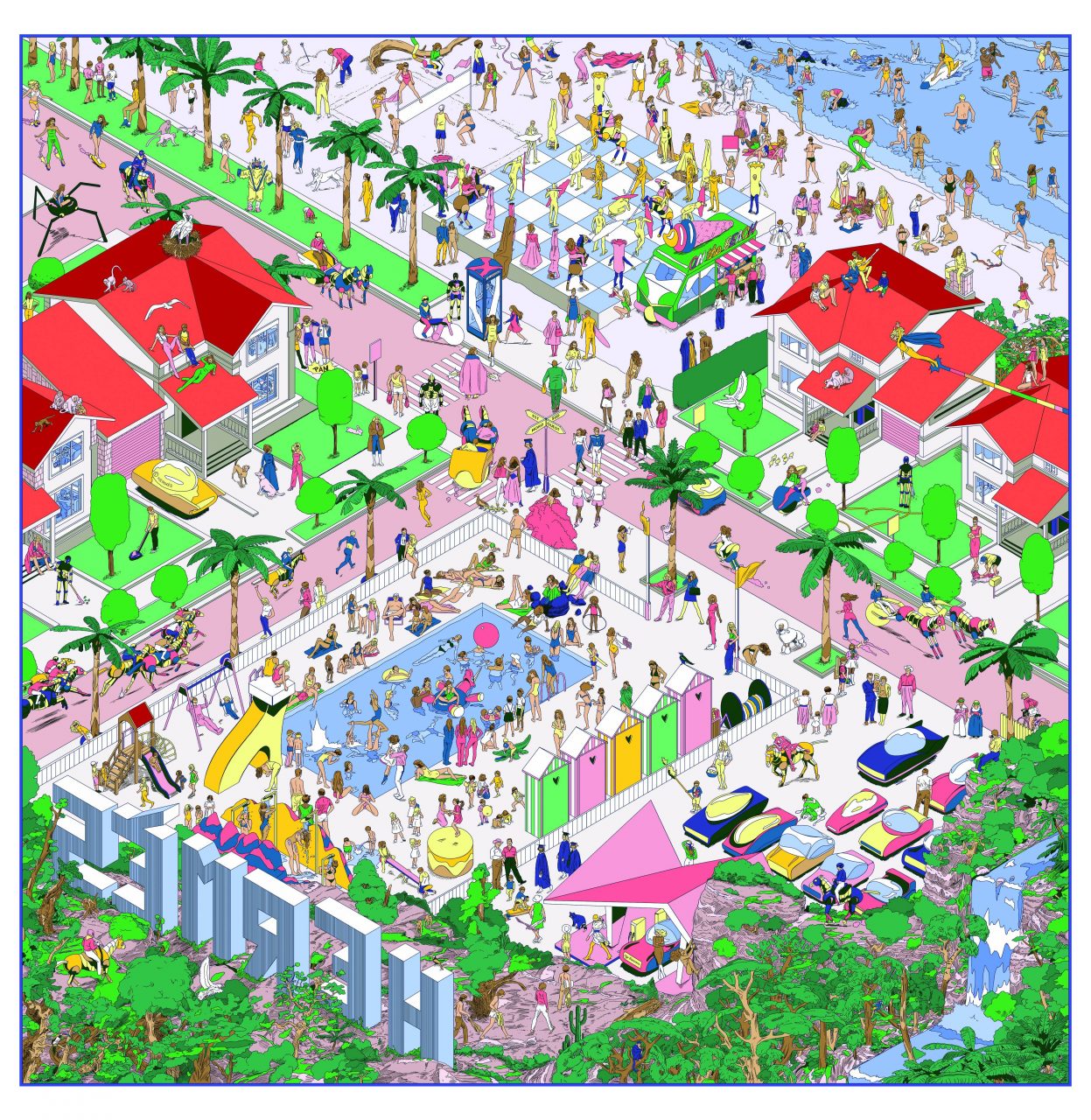 插畫家 Ugo Bienvenu 筆下的度假小鎮,靈感源自美國漫畫,透過充滿未來感的意象,頌揚甜美的夏日和無憂的海濱假期。構圖細節豐富有趣,人物千奇百怪,有飛越屋頂的超人、在海旁奔跑的馬,以及躲在救生員臂彎中的美人魚。