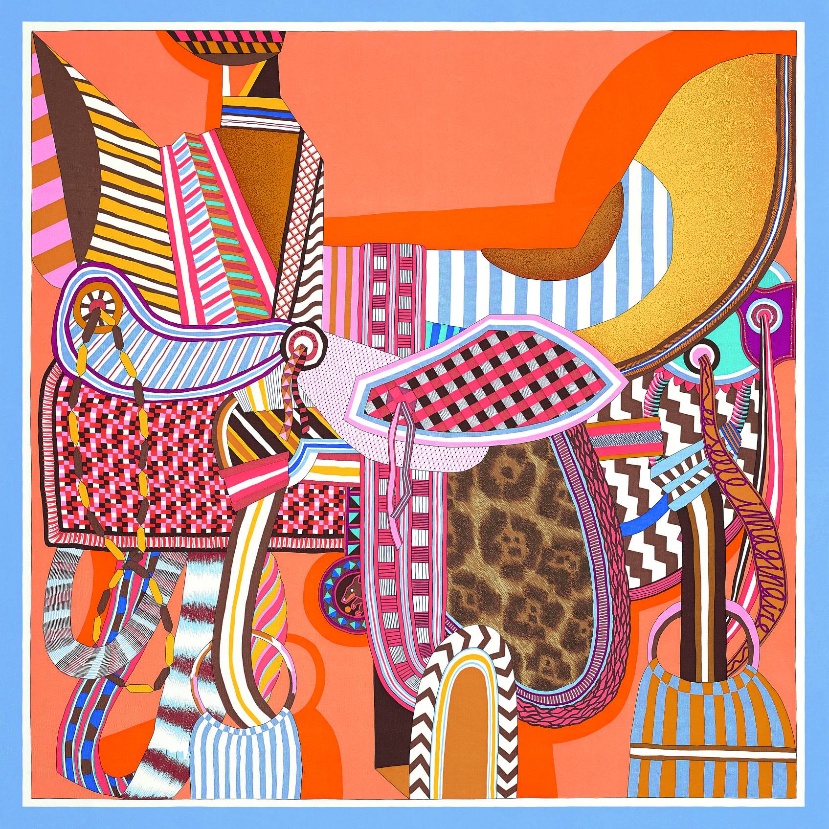 Jan Bajtlik 從 Émile Hermès 系列中發掘出大量寶藏,萃煉成這款饒富想像力的馬鞍圖案。繩藝、扭結和錯視浮雕圖案為構圖增添動感,恍如一幅勾勒出遙遠疆土的地圖,邀人踏上旅途。設計師更運用巧思,將愛犬 Kluska 的側影悄悄地融入構圖中。