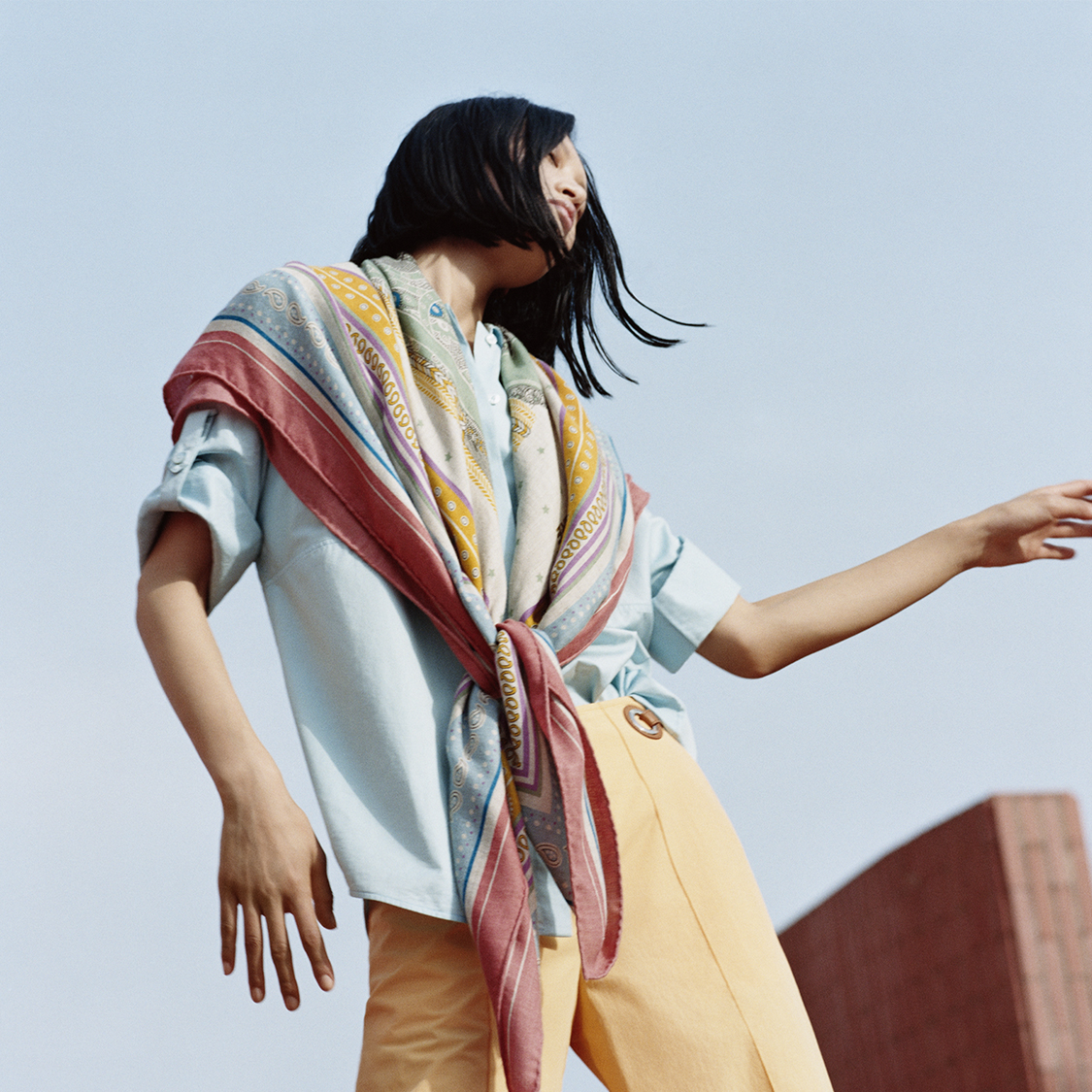 透過不同大小與圖案的絲巾打造各類型上衣,從披肩造型到到雙扣子配襯,能夠為整身服裝帶來不一樣的視覺效果。