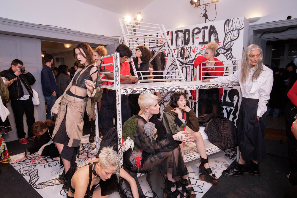 YEUNG CHIN 2019秋冬系列 “Utopia”,繼續展現品牌一貫大膽叛逆風格:不對稱及層疊剪裁,成就破格而帶點偏執的時尚感;起用銀髮、有紋身等別具個性的模特兒,以音樂、戲劇、插畫等不同的藝術元素融入演出,帶給觀眾一場極具張力的表演,不難令人想像到設計師楊展的靈感來自兩齣具爭議性的軍事主題電影-意大利的《The Night Porter》(1974) 和美國的《Red Sparrow》(2018)。