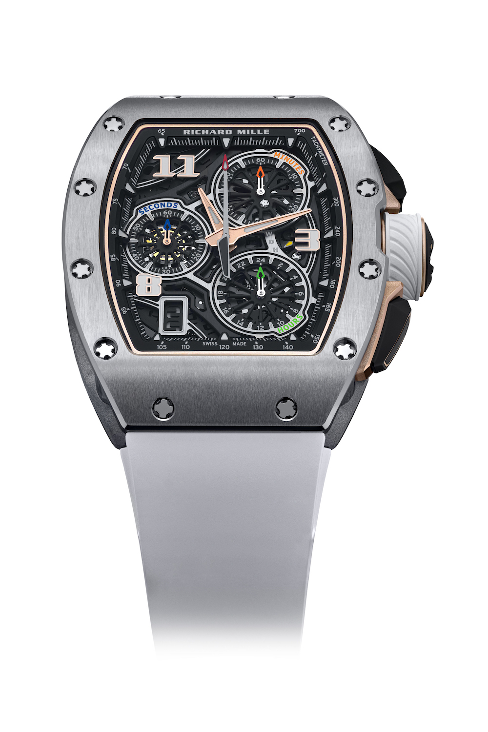 Richard Mille 工藝毋庸置疑,近年更成為社交媒體上新世代最愛的奢華腕錶品都之一。全新款式 RM 72-01 Lifestyle 自家機芯計時碼錶,以獨特的韻律節奏展現出創新設計與卓越性能。RM 72-01 錶盤不以明顯的12、3、6、9為時標,反而以三個時標︰3、8、11為三拍子的節奏定調,配合錯落的三個計時盤,令人一見難忘。它不但顯示出計時刻度,同時也代表三拍一小節的韻律節奏。不同指針(藍色秒針、橘色分針、綠色時針)由6齒導柱輪協調,在各自的計時盤內舞出韻律有致的節奏,表示時間的方式複雜而有趣。