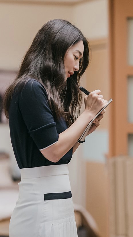 由申敏兒飾演的女主角「尹惠珍」性格溫柔而堅定。她在劇中的造型多為優雅知性風格。最具代表性的一定是各種風格、低飽和度顏色的襯衫,給人乾淨俐落的感覺。特別是當她要去首爾參加婚禮時穿上的 Gucci 絲質襯衫配上同色系西裝褲,溫柔浪漫又氣場十足。