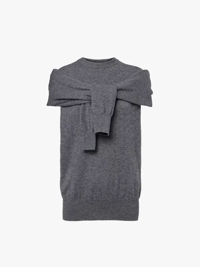 針織單品不僅能穿著,更是絕佳配飾。將毛衣隨性披掛在肩膀並打結,既能增添色彩層次,又可營造不經意的時尚輪廓。