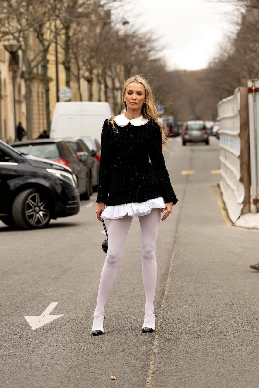 正如前面提到的,白色絲襪象徵著浪漫和優雅,因此我們認為將它們與相應的服飾結合在一起是必要的,例如中長裙或氣球裙。根據Chanel的說法,這種配件與黑色鞋子形成更強烈的對比效果,而街頭時尚則建議選擇與襪子相符的鞋子,以獲得非常有利的視覺效果。