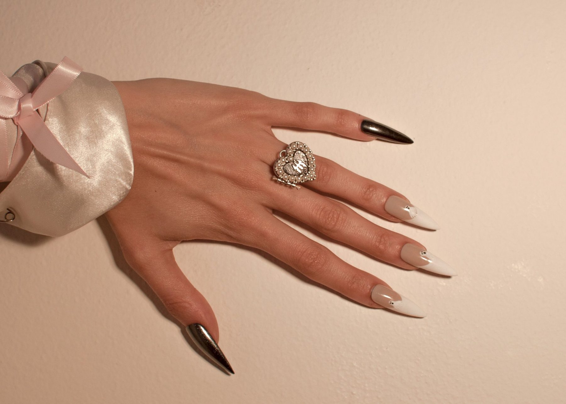不過,近期的設計會發現加入了不少粉色、愛心、珍珠和飛馬等的少女感元素,溫柔與酷辣共存,滿滿溢出甜美氣息,讓人愛不惜手。中世紀宮廷的貴氣、怪異的圖騰與粗獷肌理混合出奇妙的氣氛,不知道這種風格有沒有擊中你的心呢?