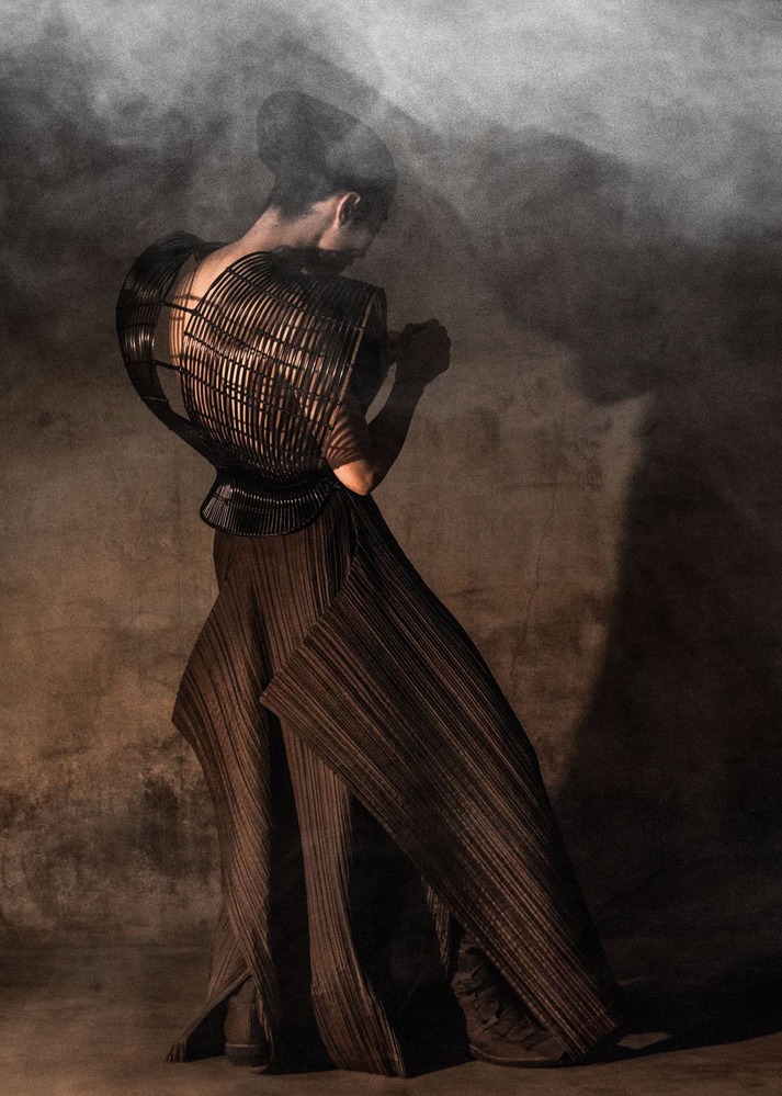 「所有的設計,都是從面料出發。」——除了鍾情織物,Issey Miyake 也著迷使用不同類型的面料和材料來創作。在 1980年至1985 年間,他以現代主義和實驗主義方式打造了 Body Works 系列,他帶來一系列雕塑服裝,並用上以前從未使用於服裝製作的硬質材料製成,當中包括塑料、藤條和金屬絲。
