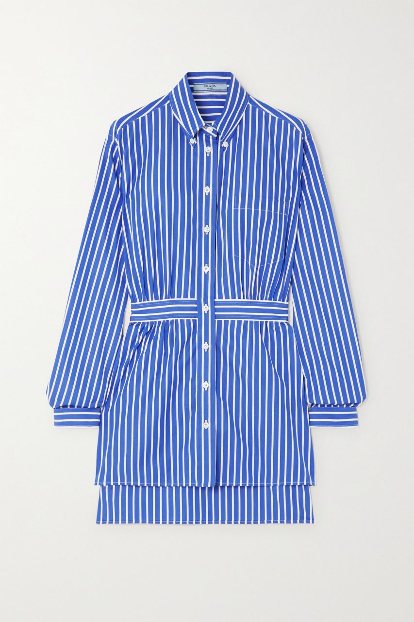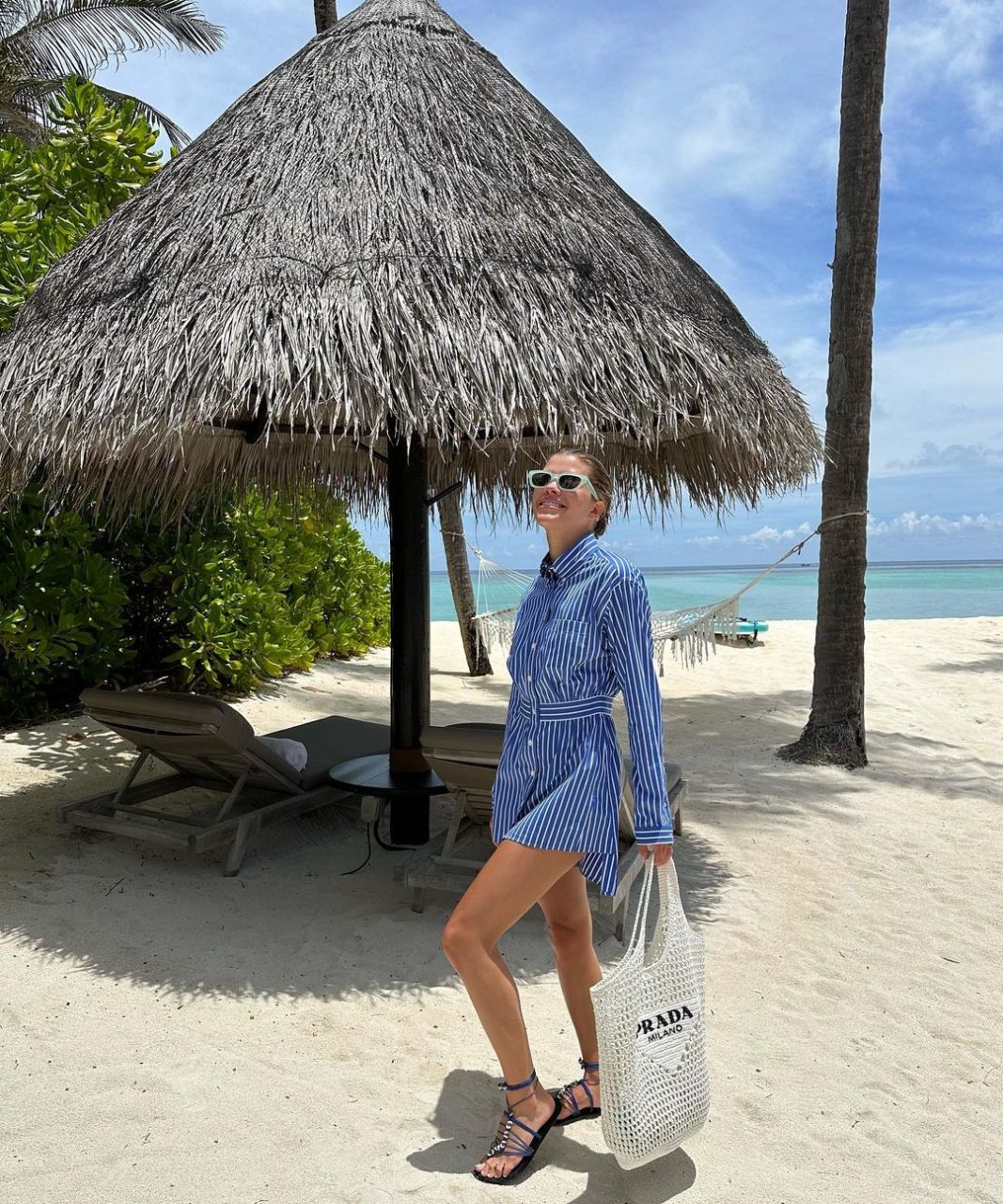 如果 Sofia Richie 的婚禮是一位夢幻的 Chanel 新娘,那麼她的度蜜月造型就是一個不折不扣的時尚 Prada Girl。這位名模一直以各款 Prada 單品來打造她的夏日度假造型,她換上一身 Prada 藍色條紋恤衫連身裙(已售罄),並配上大熱的 Prada 編織手袋以及一雙綁帶涼鞋,打造出適合於日常與沙灘遊走的完美夏日造型。