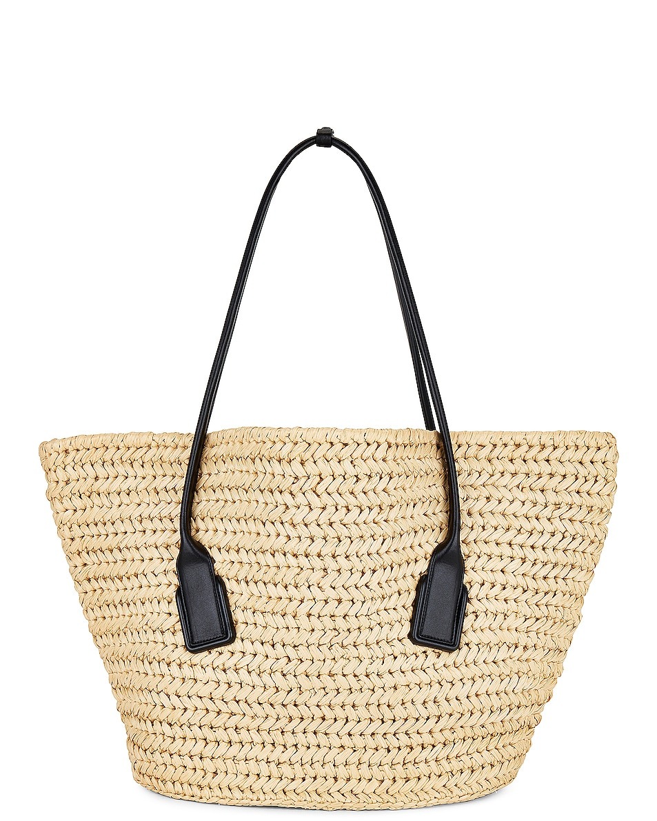 但讓造型更具夏日度假風情的穿搭秘訣是?配上一個夏天必備的拉菲草編織手袋,這位 FWRD 創意總監配上了一個可以「裝下夏日出行一切」的 Bottega Veneta Arco 草織手袋,讓人頓時視覺降溫。