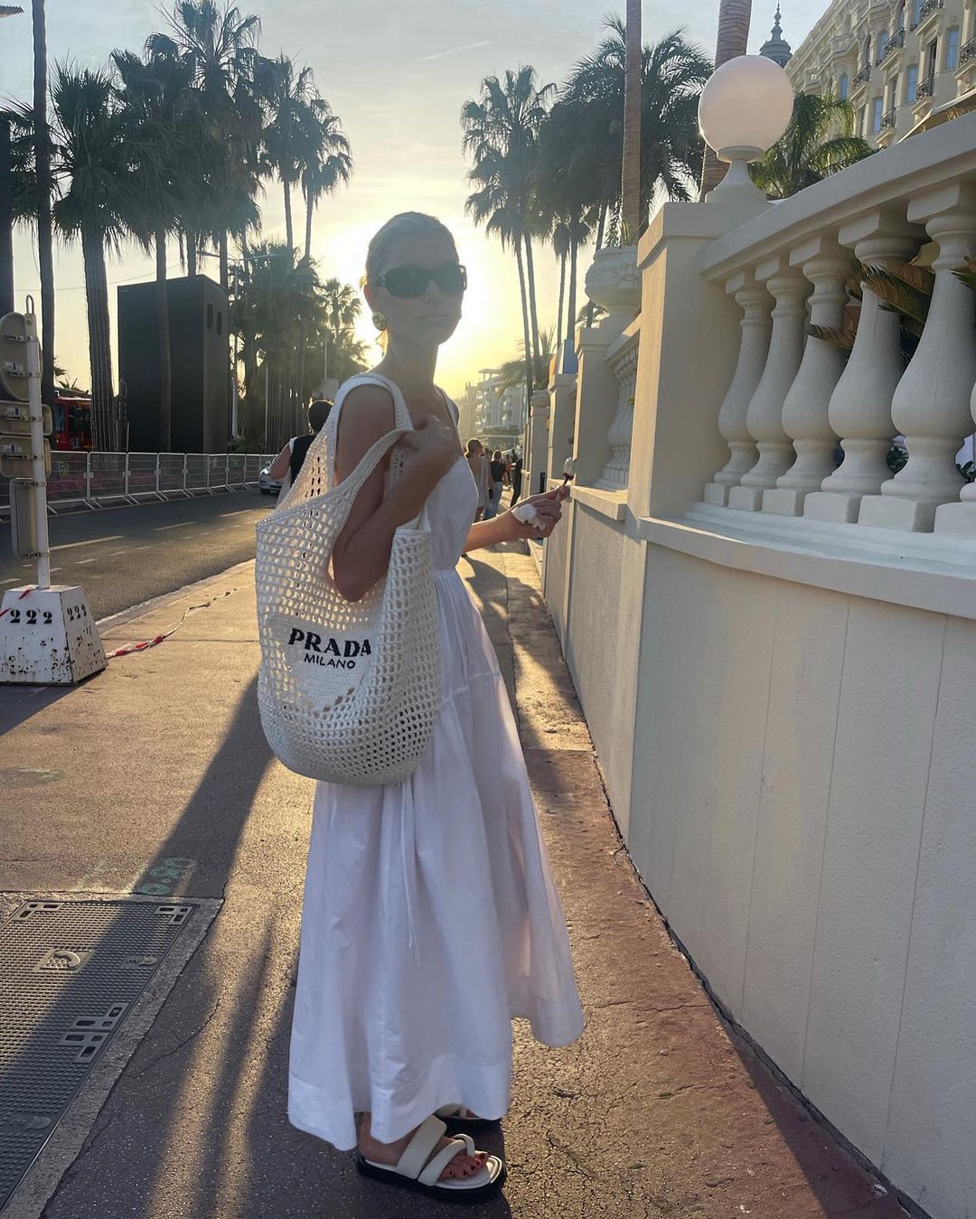 或許沒有任何單品比白色連身裙更適合夏日了。像名模 Elsa Hosk 也同樣參考這「全白法則」作為她的夏日風格要點。她早前前往南法度假,換上自家品牌 Helsa 的白色連衣裙配上一雙 Padded 皮革涼鞋(還有再次出現的同款 Prada 編織手袋),打造出一身輕便又舒適的盛夏造型。
