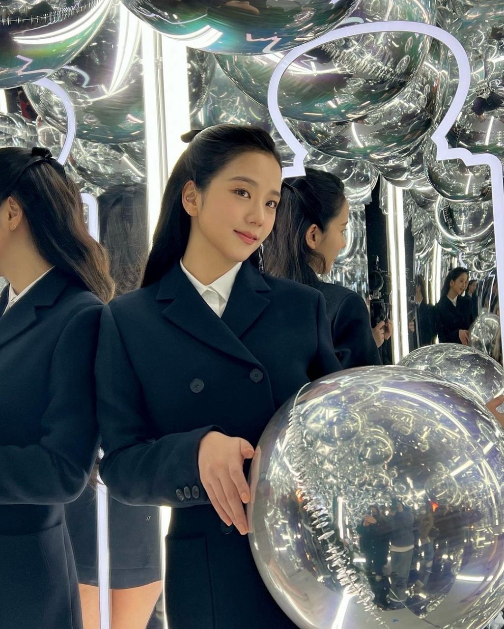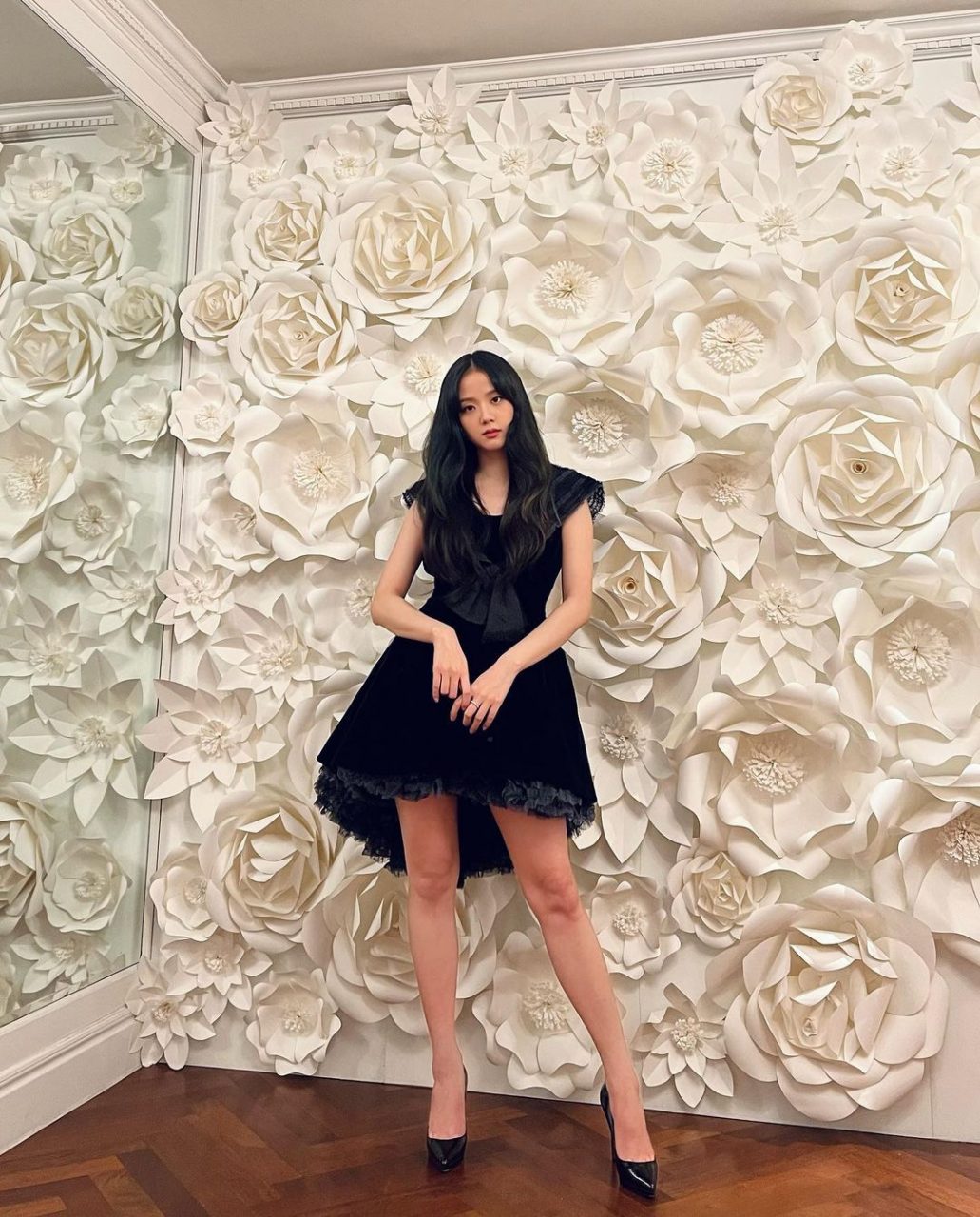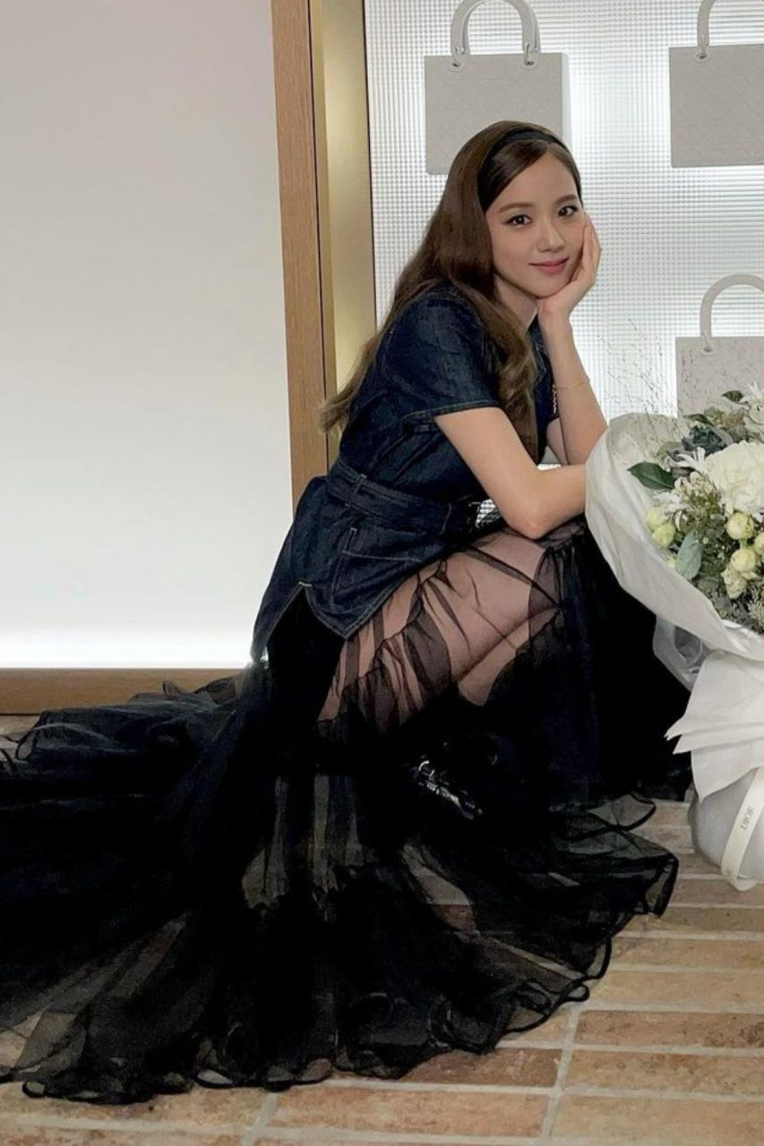 親民品牌 & other stories 在英國深受少女歡迎,這件珍珠 peter-pan 圓領的小黑裙完美展現了 Jisoo 可愛一面—— mary jane 厚底鞋、白色長筒襪、蝴蝶結頭帶,全符合了 「lolita 風格」的公式。