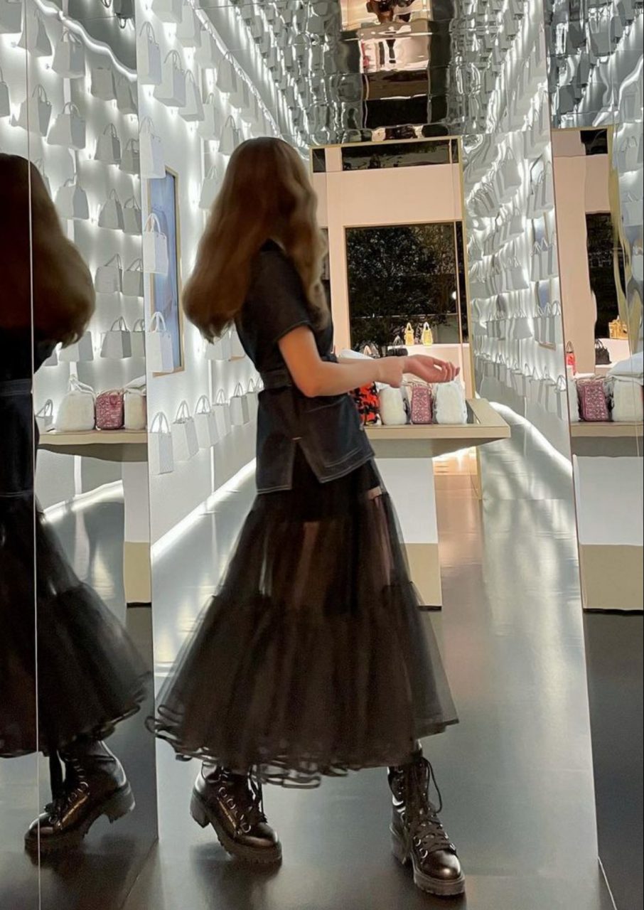 在上衣外扣上腰帶,也是將造型昇華的小技巧,不用高腰剪裁也能強調出身型比例。實色的上衣配上透視黑紗散裙,強烈的對比以腳上的厚重皮靴在視覺上拉回平衡,更是以現代手法演繹了 Dior 50 年代的經典 「New Look」造型。