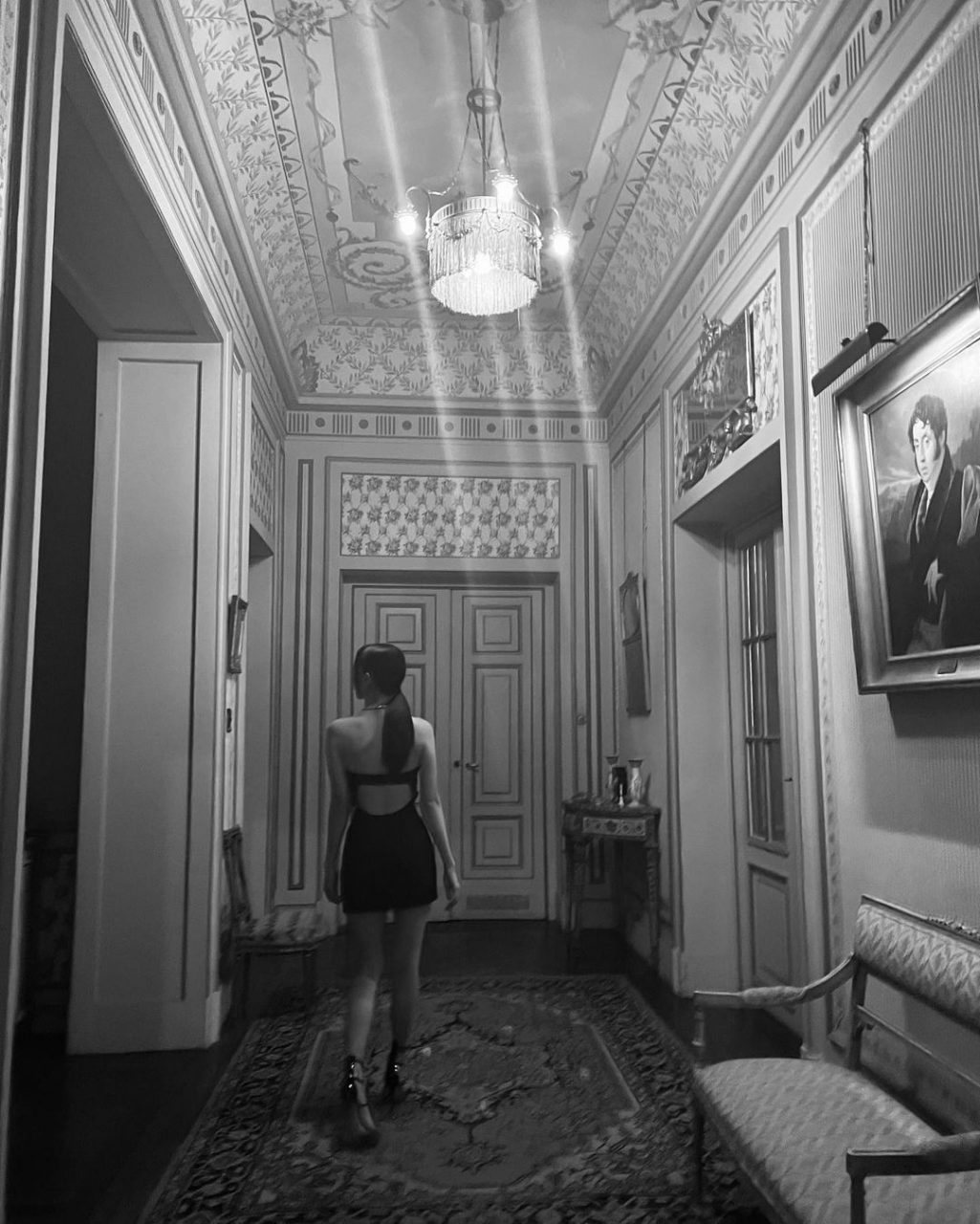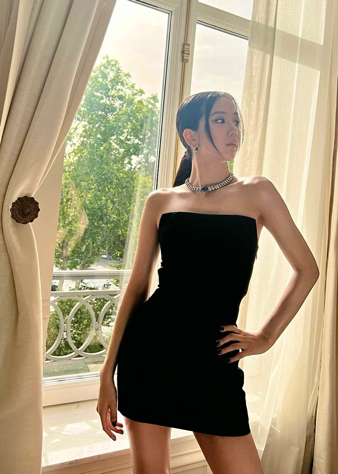 Jisoo 於西班牙出席 Cartier 的珠寶活動,身穿倫敦品牌 Rokh 貼身露肩小黑裙。除了讓首飾成為主角,身後的露背設計更讓人眼前一亮。仔細一看,Gianvito Rossi 綁帶高跟鞋的橫線與背部的橫帶設計相互呼應,讓整體造型更統一。