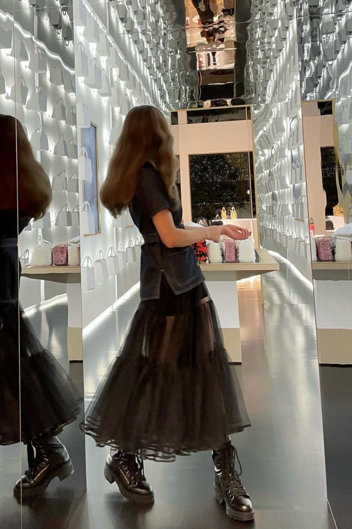 在上衣外扣上腰帶,也是將造型昇華的小技巧,不用高腰剪裁也能強調出身型比例。實色的上衣配上透視黑紗散裙,強烈的對比以腳上的厚重皮靴在視覺上拉回平衡,更是以現代手法演繹了 Dior 50 年代的經典 「New Look」造型。